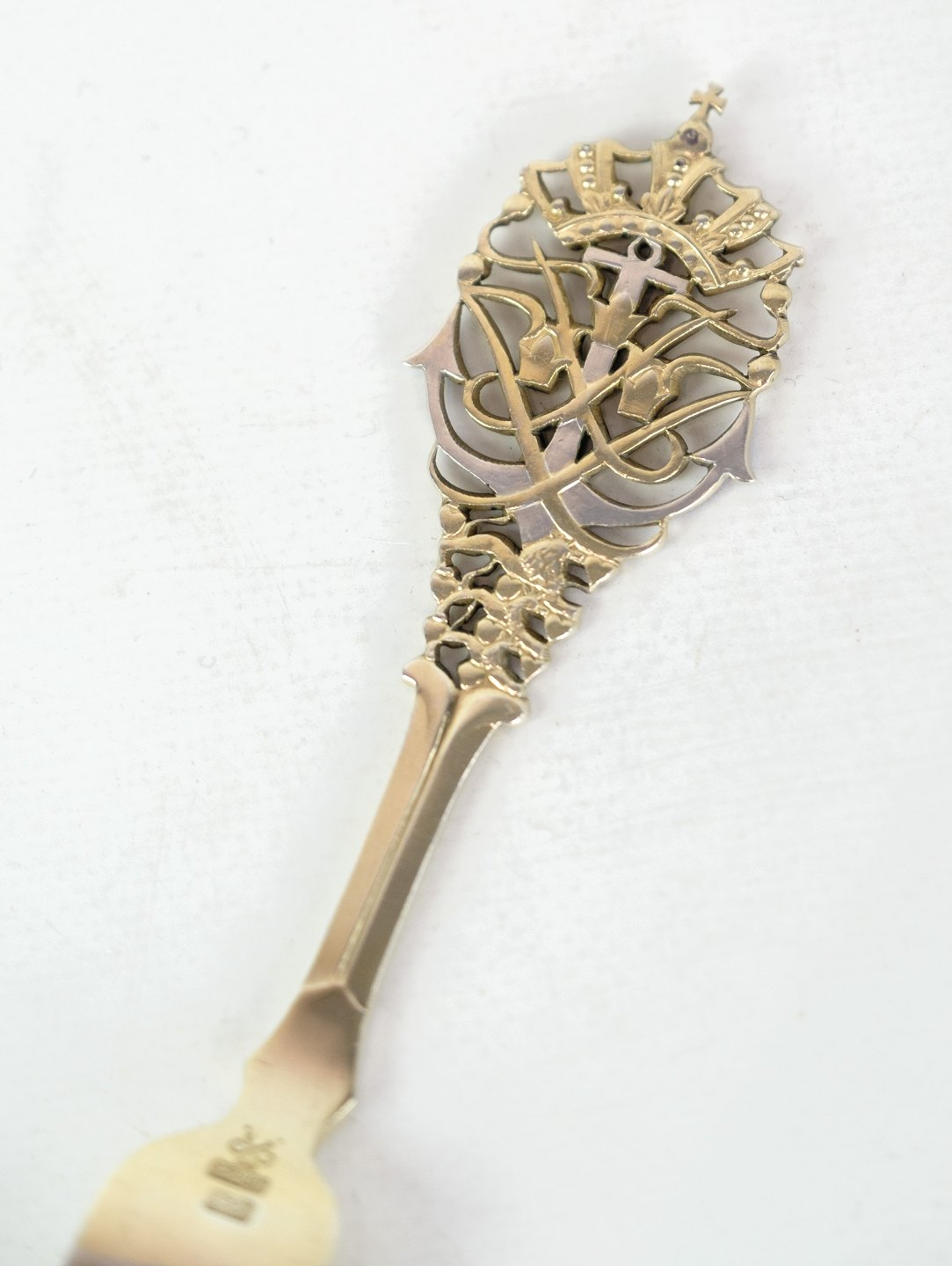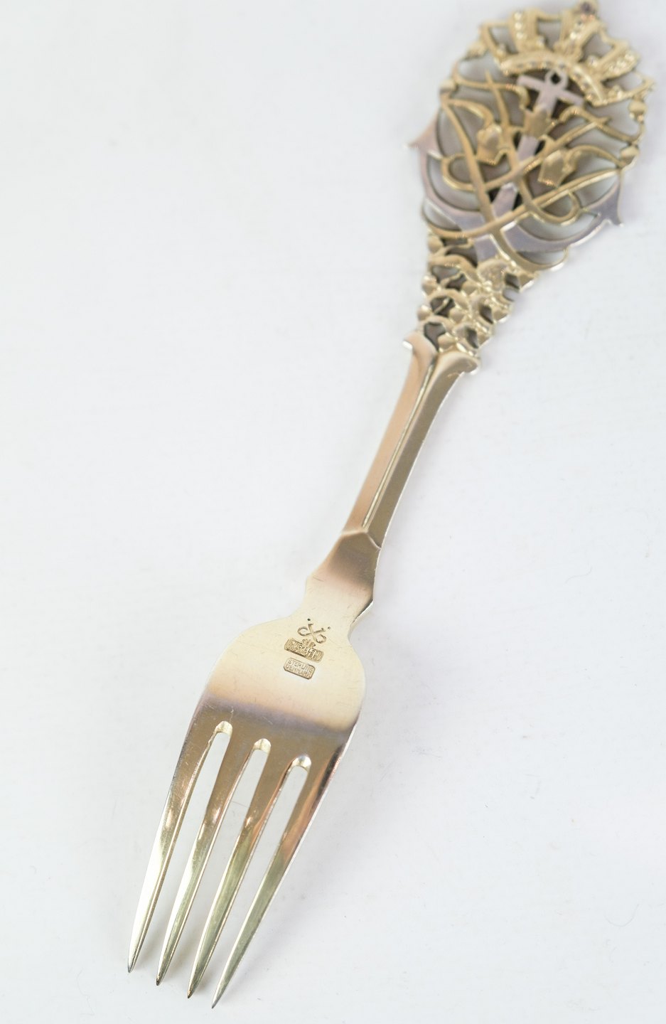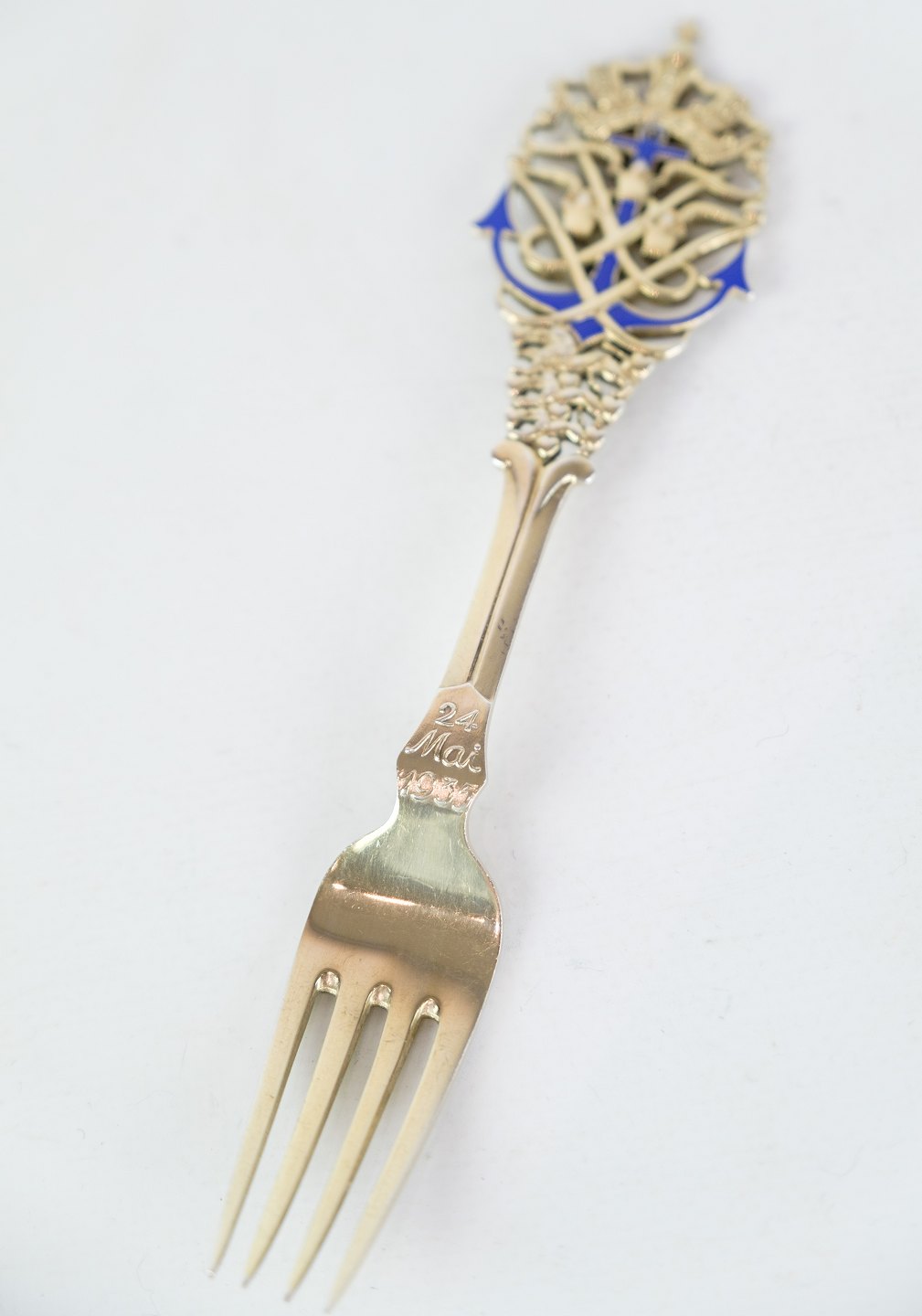 Jubilæumsgaffel fra A. Michelsen i sølv forgyldt i anledning af Kronprins Frederik og kronprinsesse Ingrids bryllup d. 24 Maj 1935.
