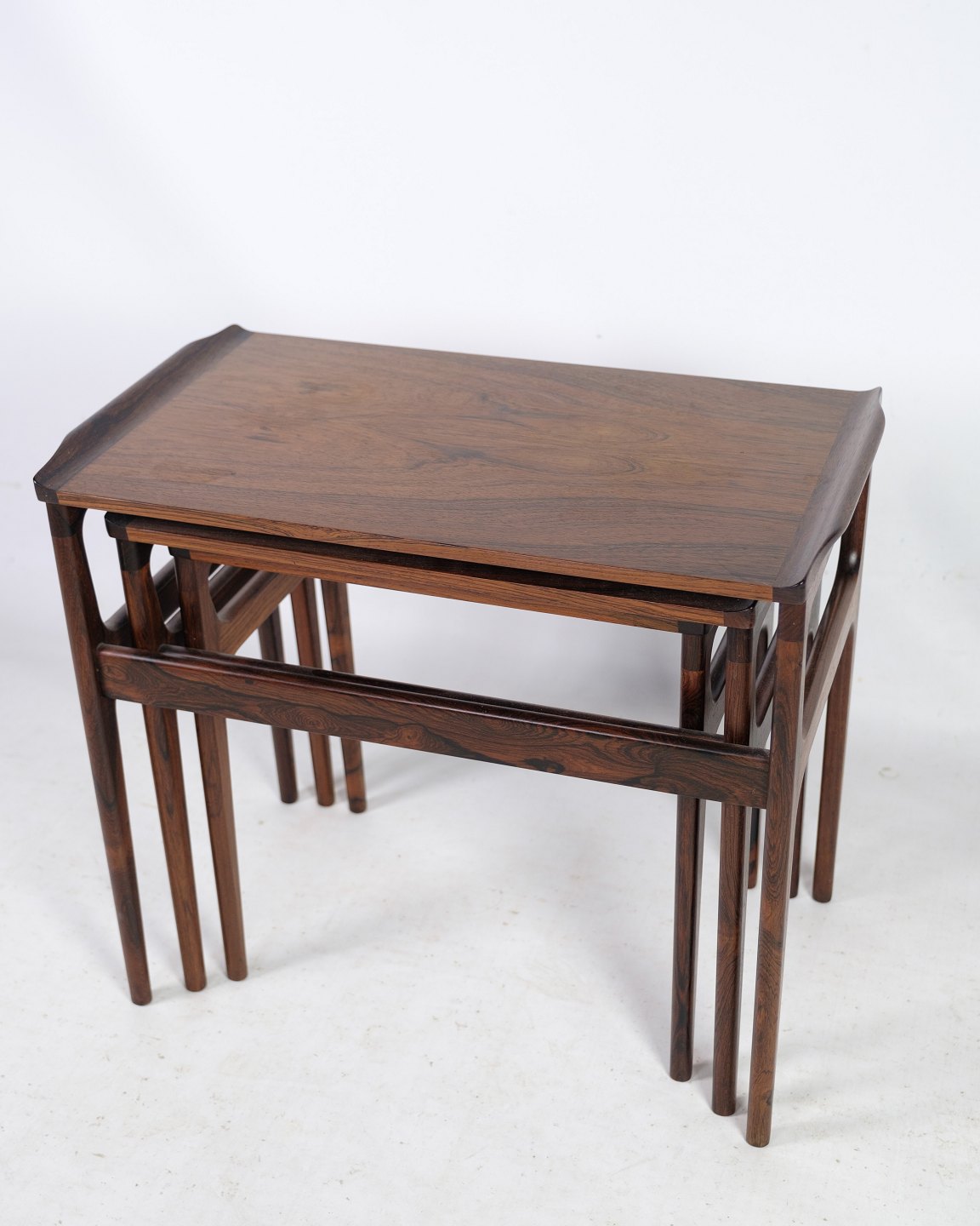 Dette sæt indskudsborde af palisander er et smukt eksempel på dansk møbeldesign fra 1960'erne. Bordene er fremstillet af Heltborg Møbler, en af Danmarks mest anerkendte møbelfabrikker fra perioden.