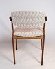 The chair's upholstery is made of a light patterned fabric that provides a soft and comfortable surface to sit on. The upholstery is attached to the seat and backrest using discreet, black rivets, which provide a stylish contrast to the light fabric.