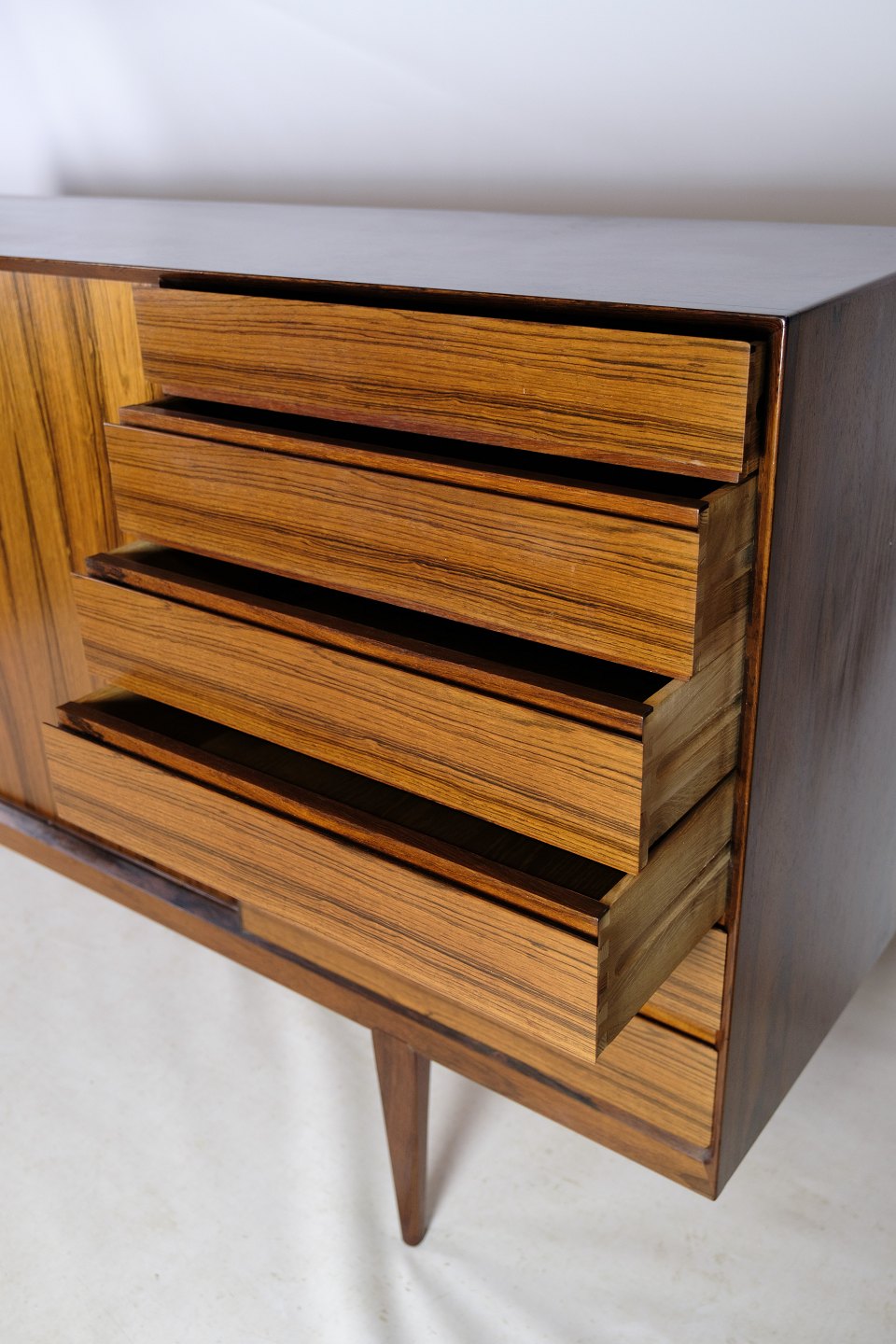 The sideboard in rosewood, designed by Henry Rosengren Hansen and produced by Brande Møbelindustri in 1960, is a splendid example of Danish furniture art from the middle of the 20th century. This sideboard exudes a timeless elegance with its beautiful rosewood, giving a warm and luxurious atmosphere to any room.