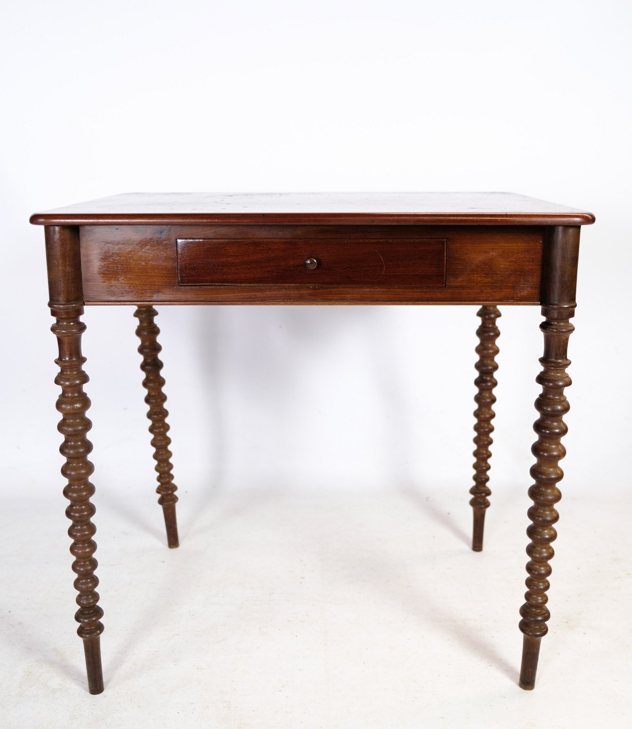 Sidebord i mahogni med skuffe i midten og runde ben fra omkring 1880'erne.