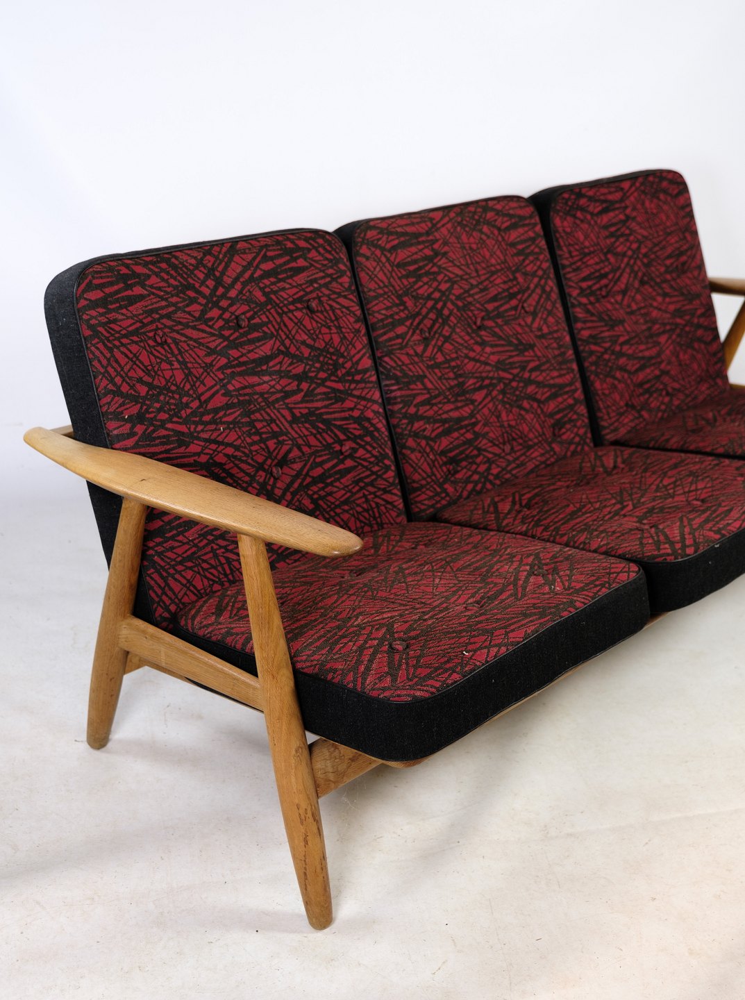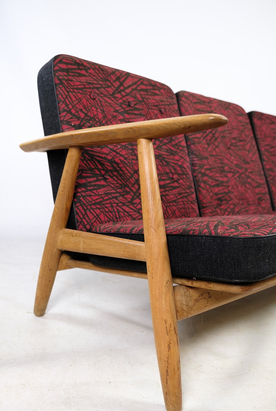 Sold3-person sofa, Model GE 240/ 3, designed by Hans J. Wegner in oak with black and reddish decorated cushions from the 1960s.