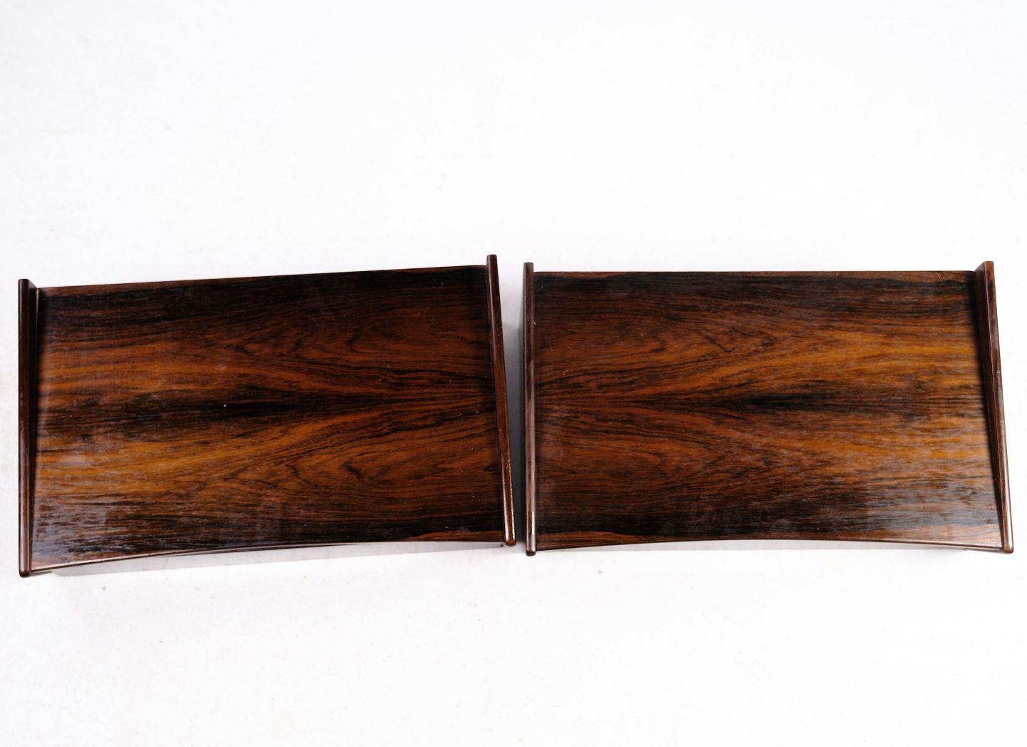 Et sæt væghængte natborde i palisander med skuffer fremstår med stempler af Ølholm Møbelfabrik, Horsens fra omkring 1960'erne.