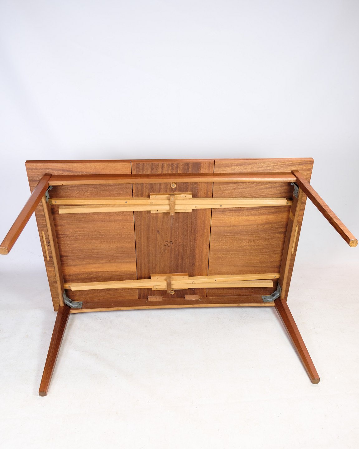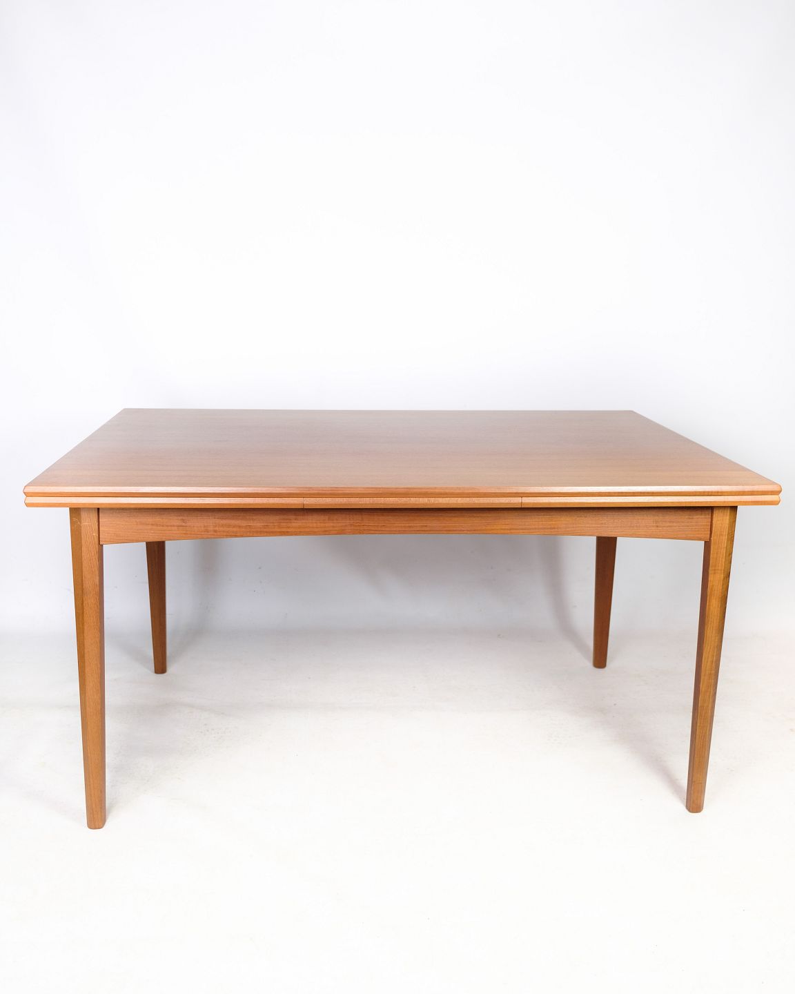 This dining table in teak is a beautiful and functional piece of furniture in Danish design from the 1960s. The table is made of high-quality teak wood, which is known for its durability and natural beauty. The design includes a Dutch extension, which allows the table to be extended when more space is needed to sit.