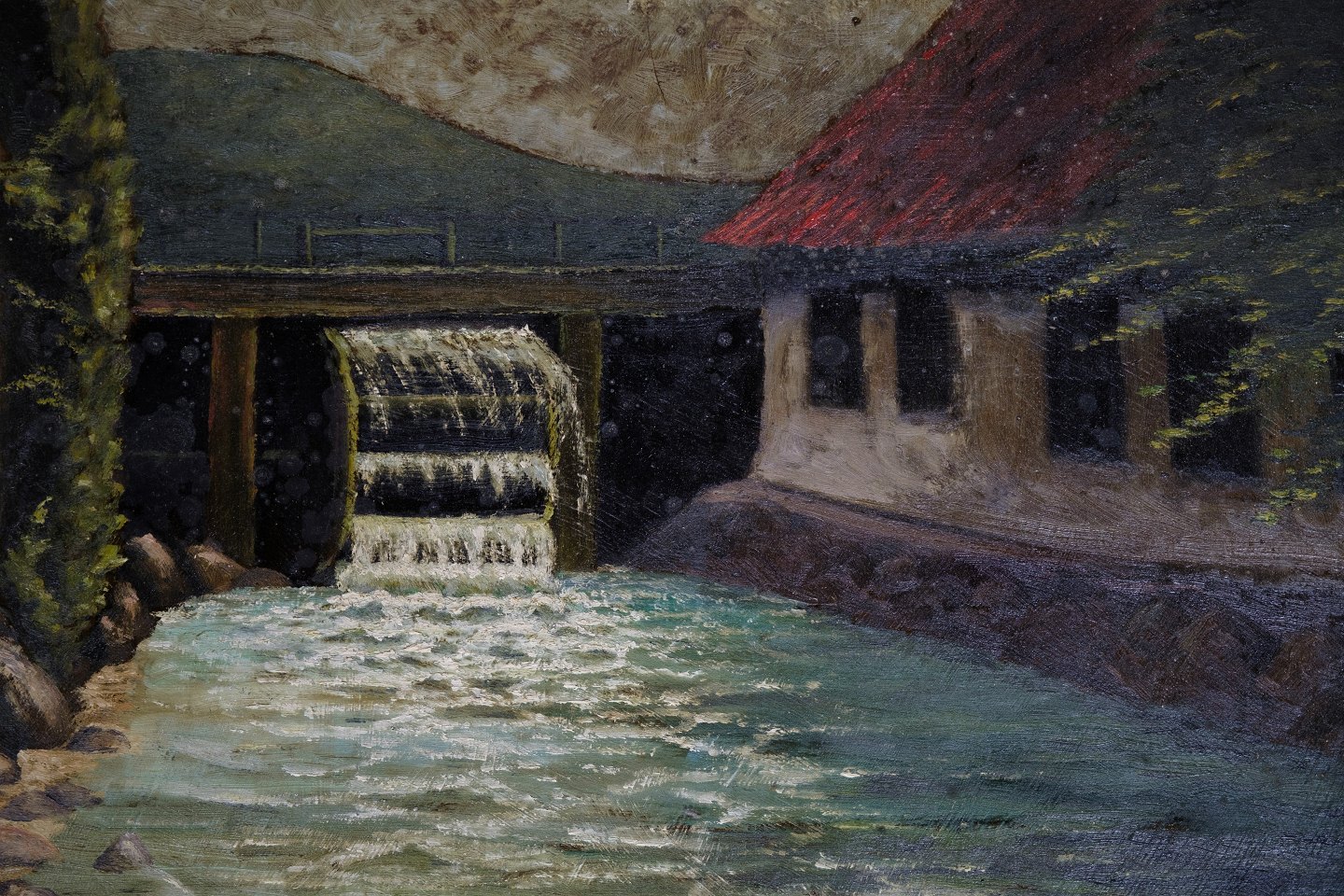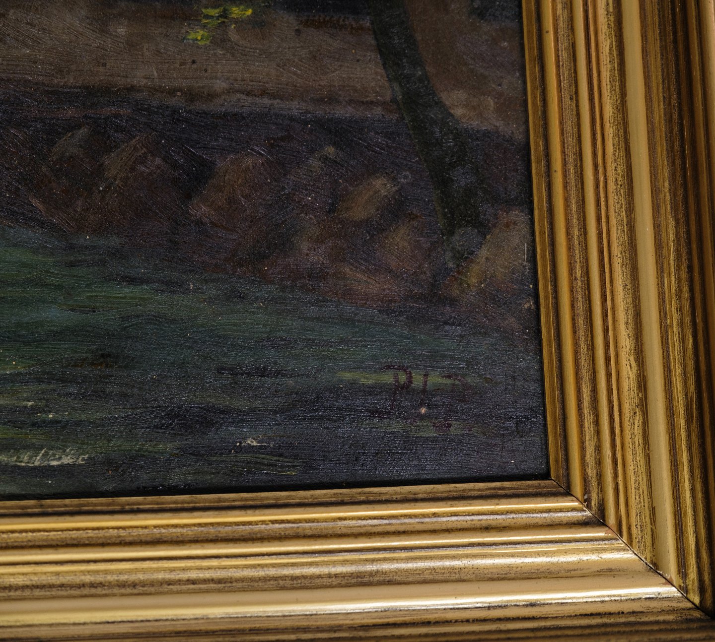 Maleri på lærredet i guldramme af byhus og vand i blå farver fra omkring 1930'erne.