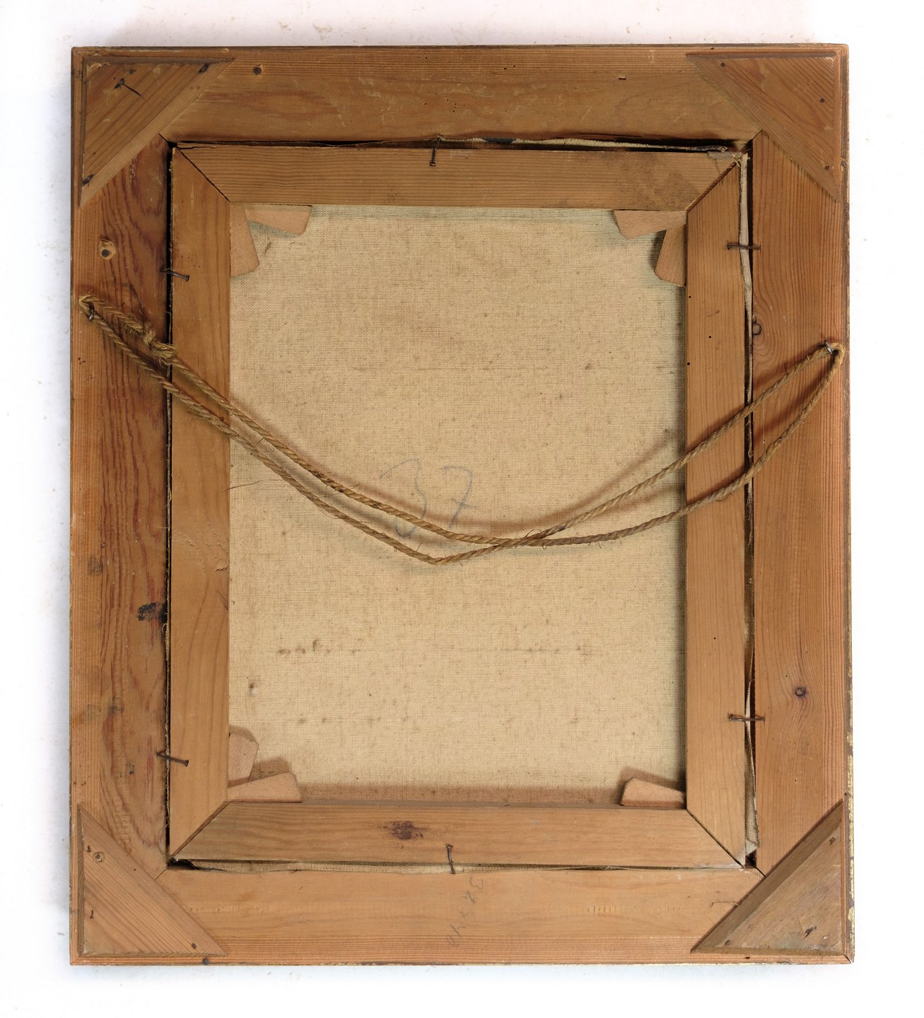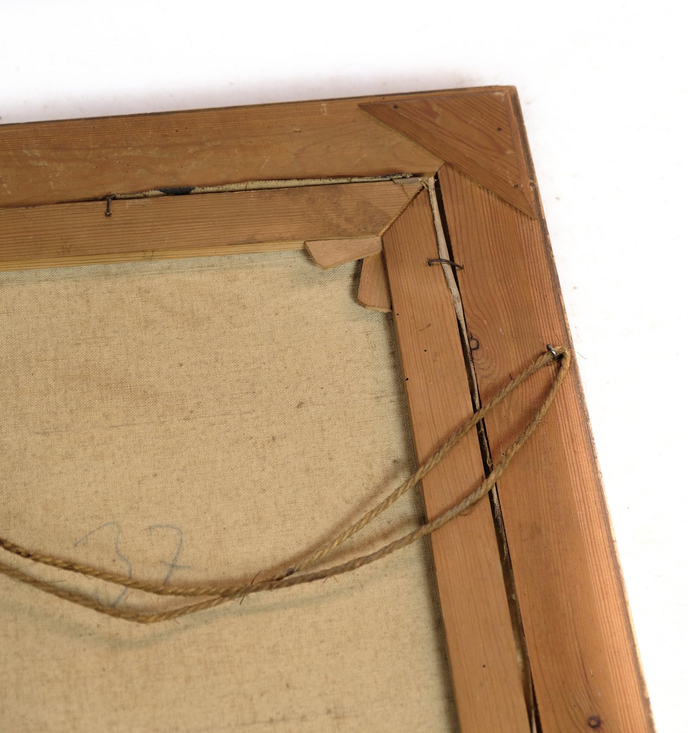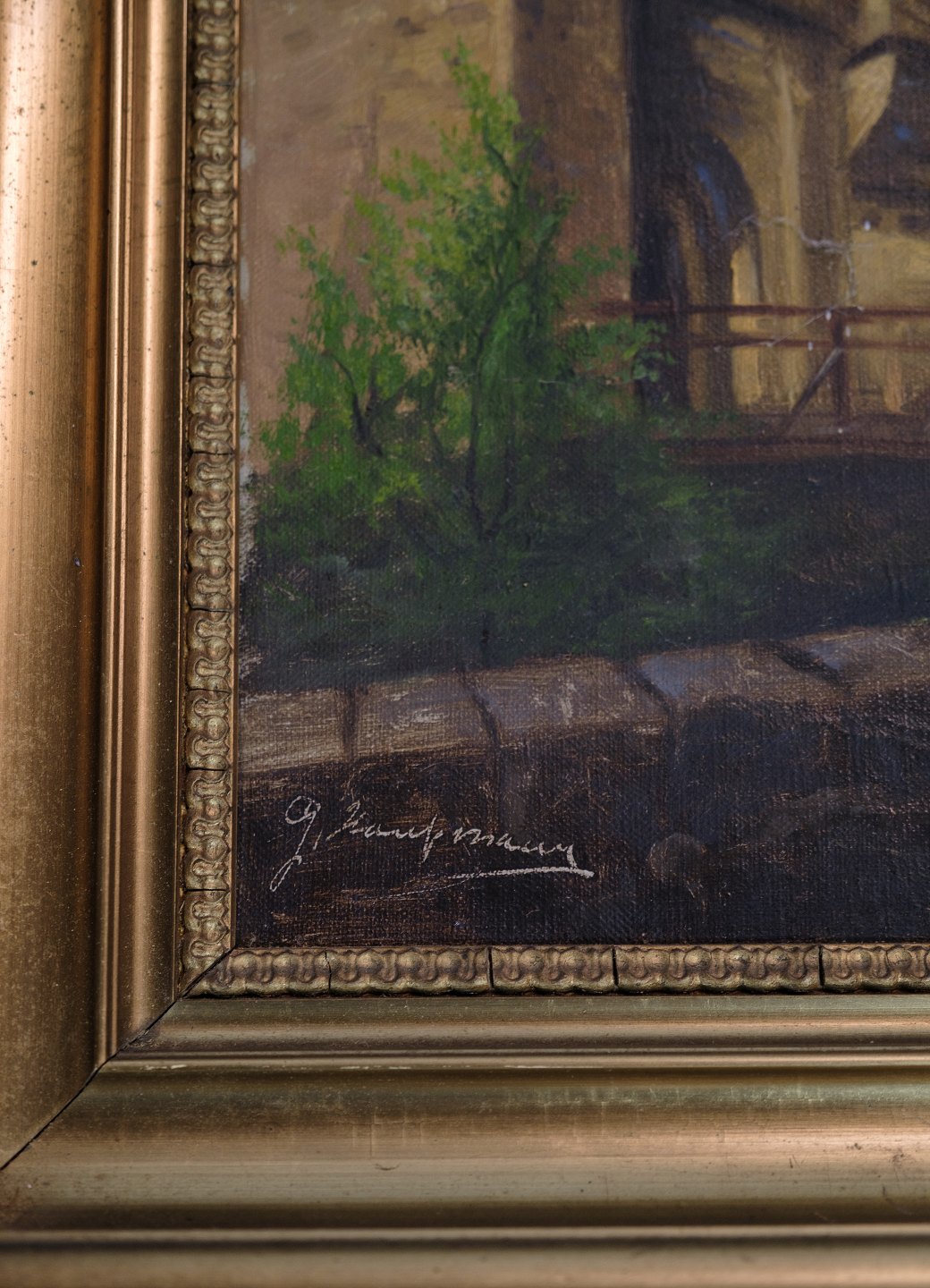 Painting on the canvas in a gold frame of a church motif in yellow and red shades from around the 1930s.
