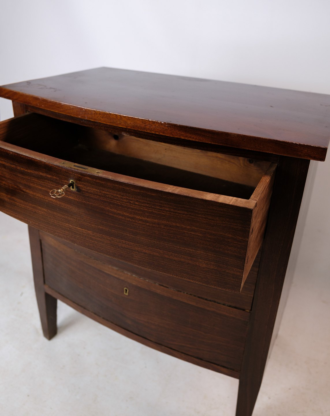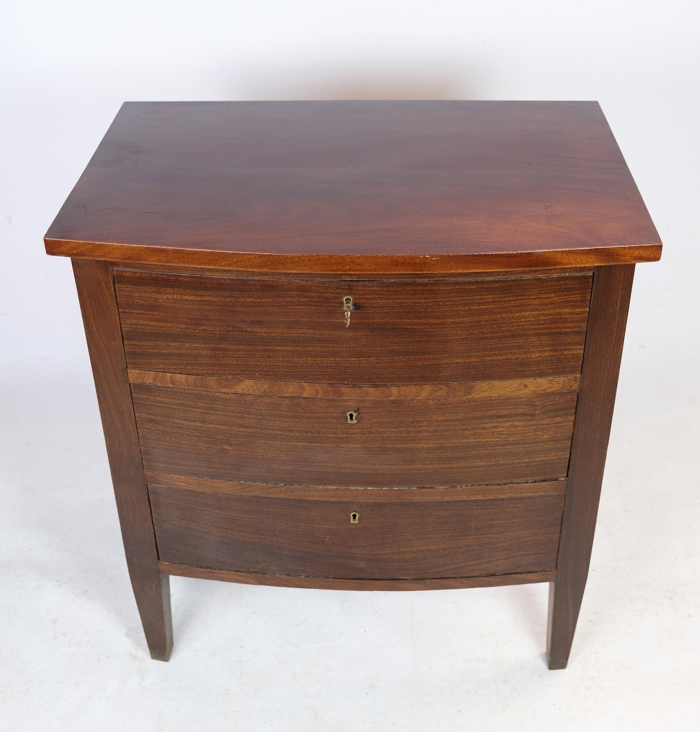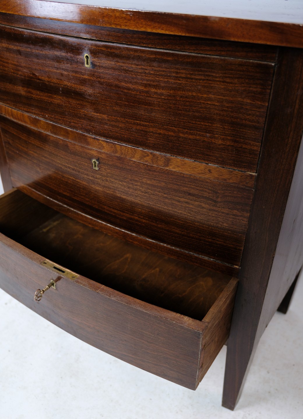 SolgtBuet kommode af mahogni og tre skuffer, i flot antik stand fra 1890erne.