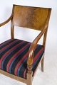 A pair of Danish Empire style hand-polished mahogany armchairs with striped fabric from around the 1920s.
