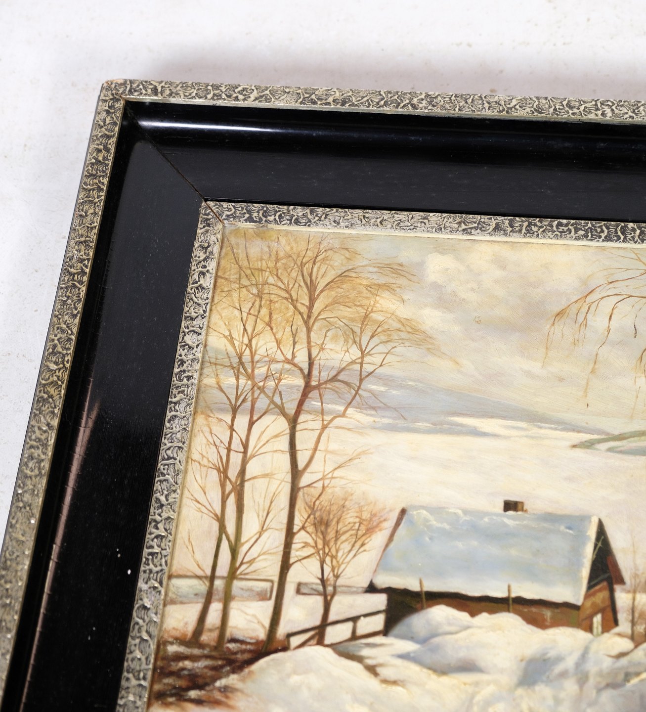 Maleri på træpladen i antik ramme af små huse og landskab med sne fra omkring 1930'erne