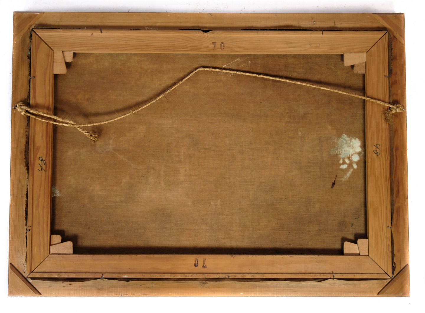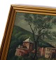Maleri på lærredet i guldramme motiv af stor landsby fra omkring 1930'erne