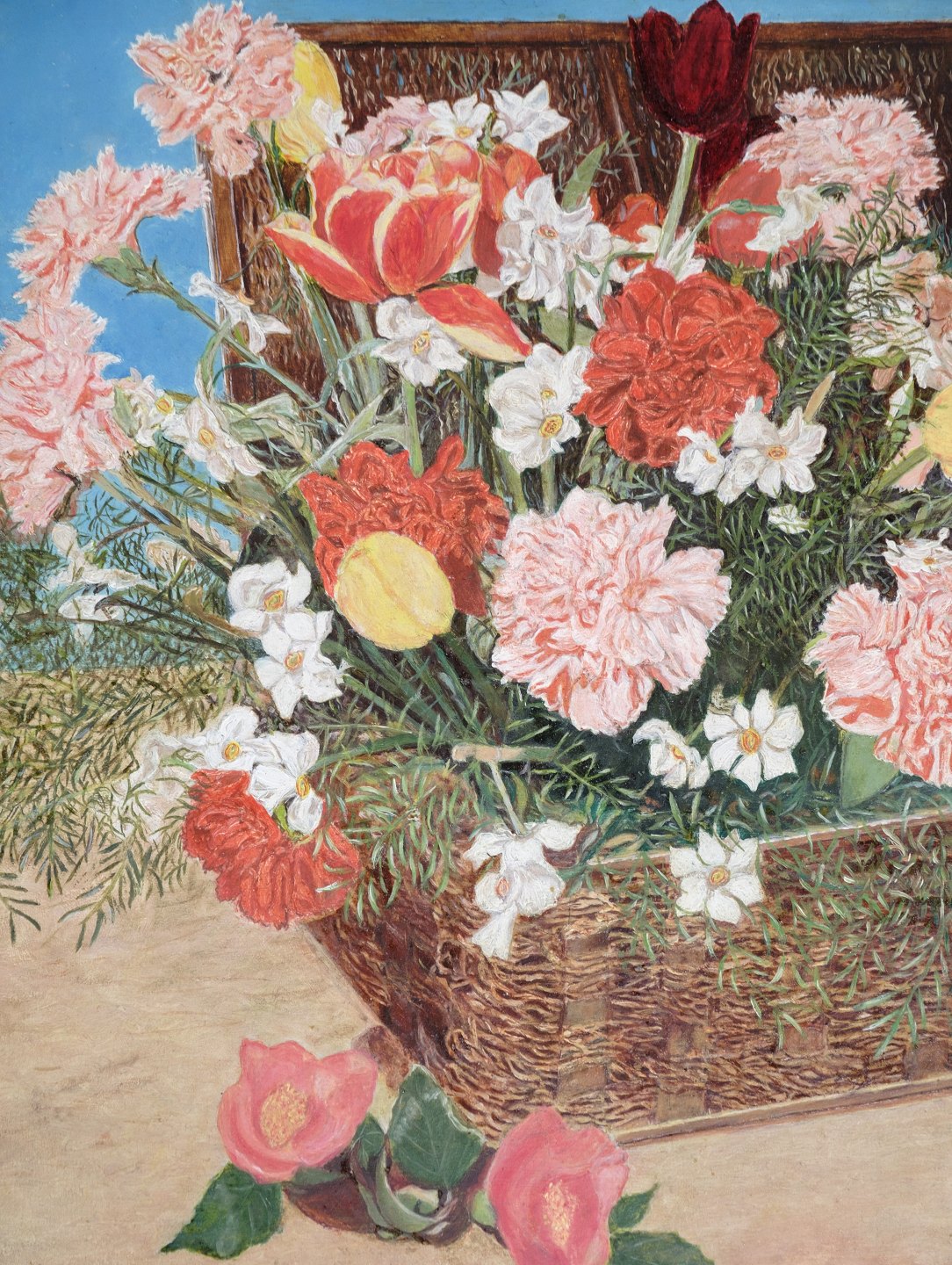 SolgtMaleri på lærredet i guldramme af blomster motiv fra omkring 1950'erne