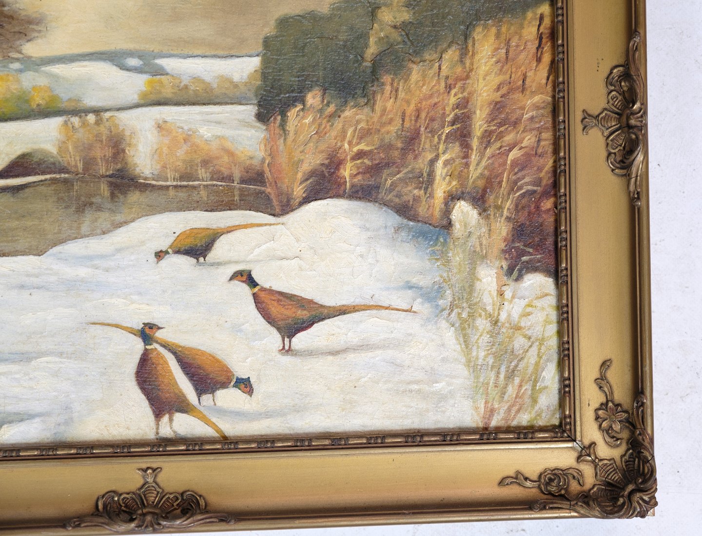 Maleri på lærredet i antik ramme af små huse og landskab med sne fra omkring 1930'erne