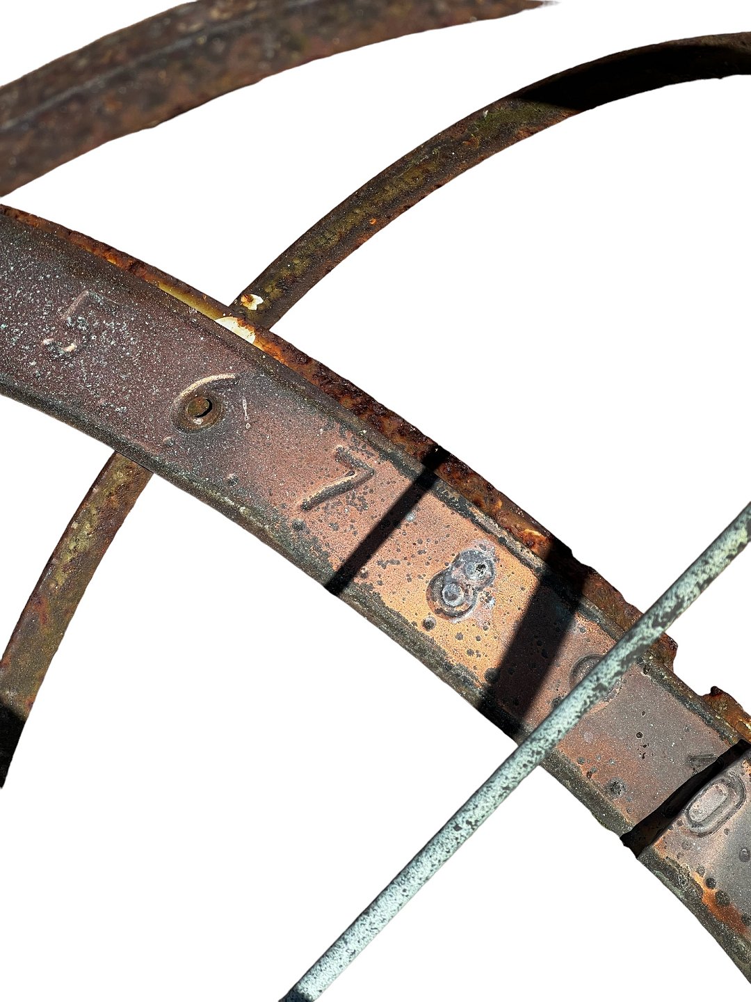 Sun clock made of iron, copper and zinc metal on a plinth of artificial stone. The sundial appears with a patina.