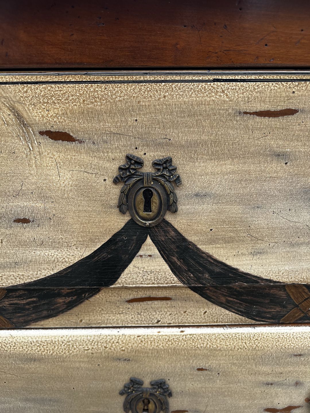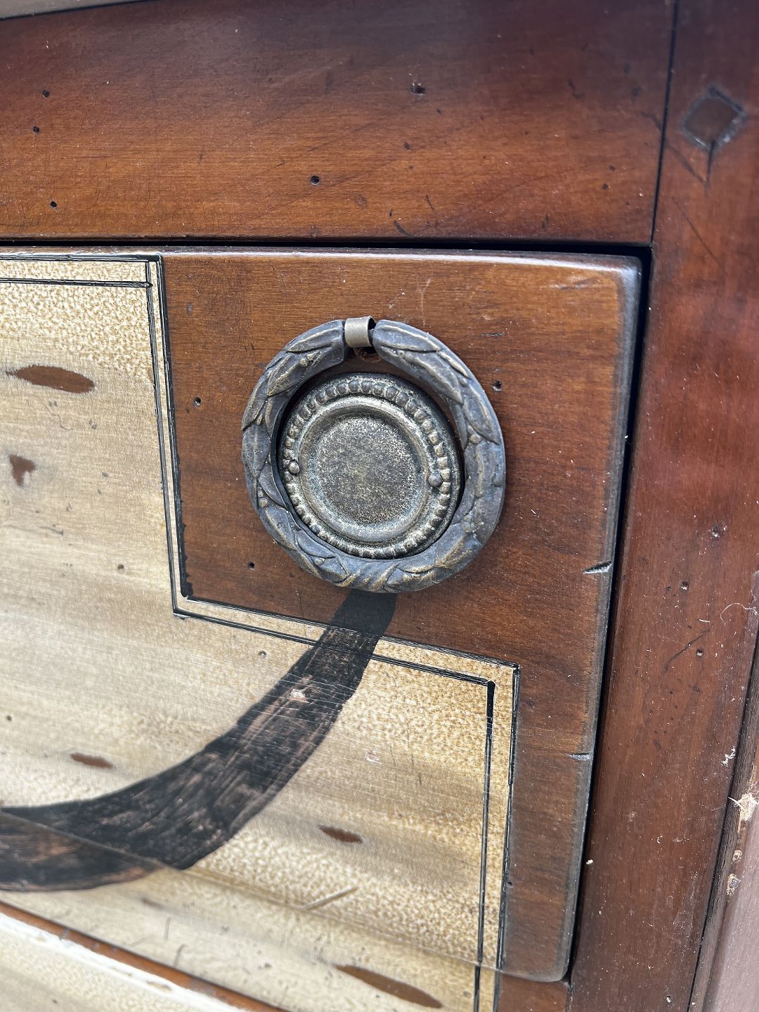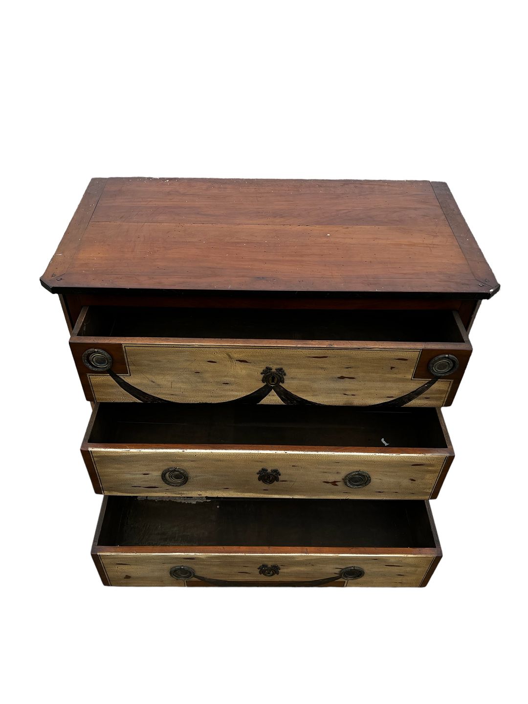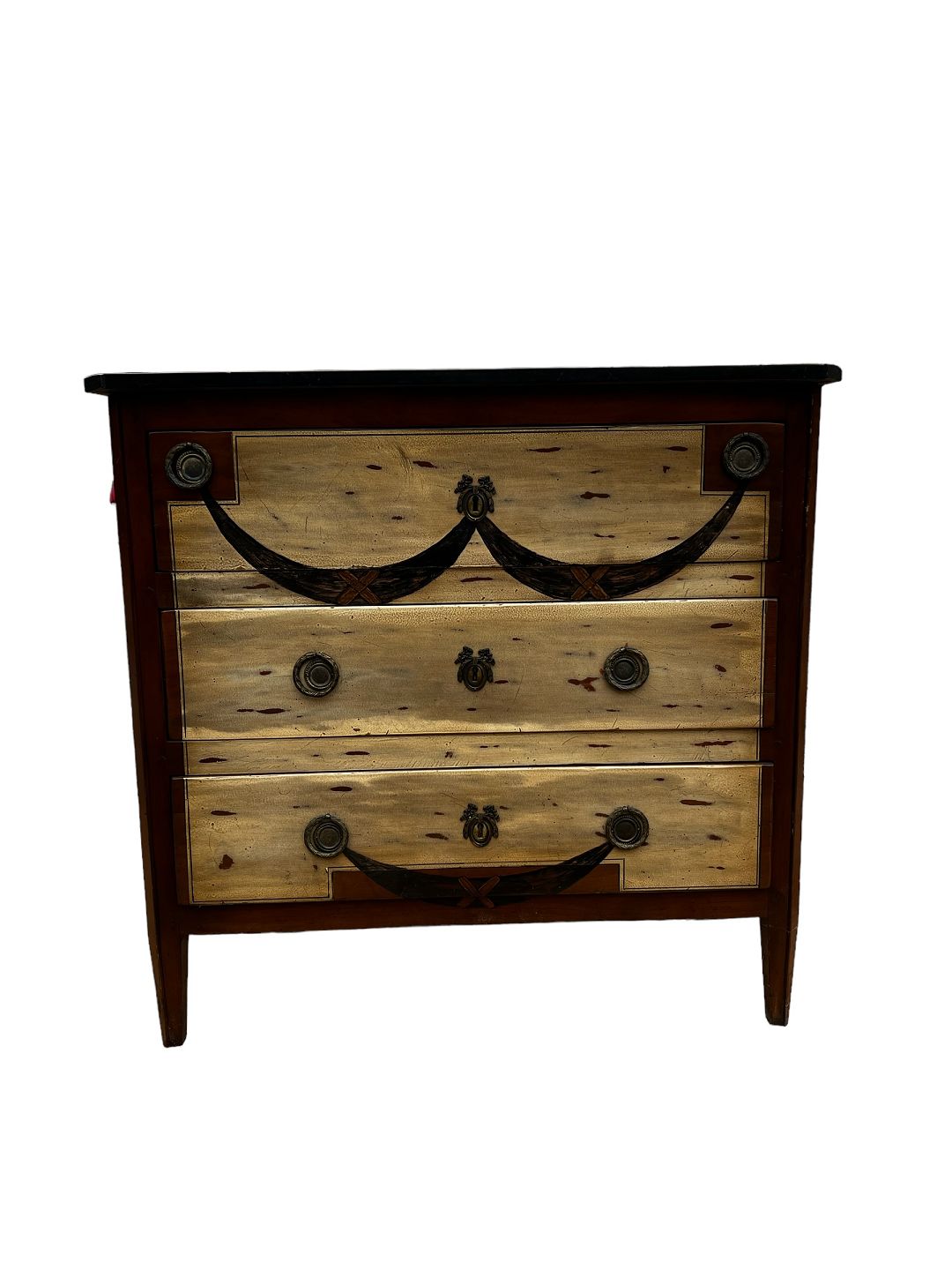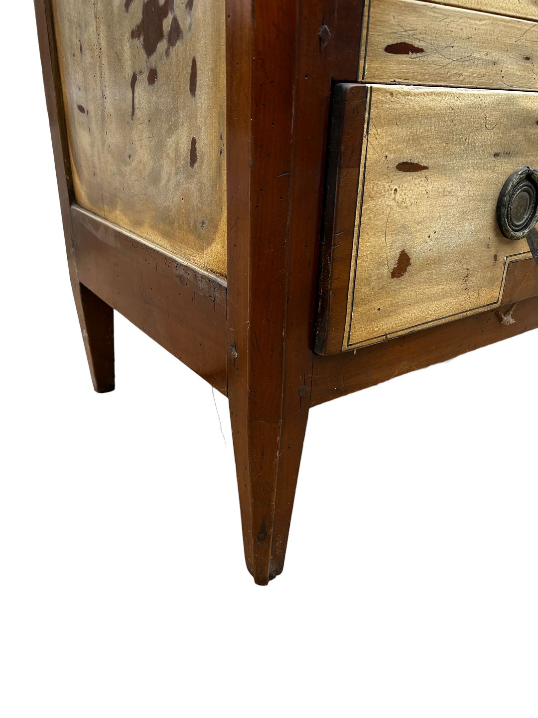 Kommode i mahogni og forskellige træsorter i form af frugttræ med patina. Fra år 1890 erne