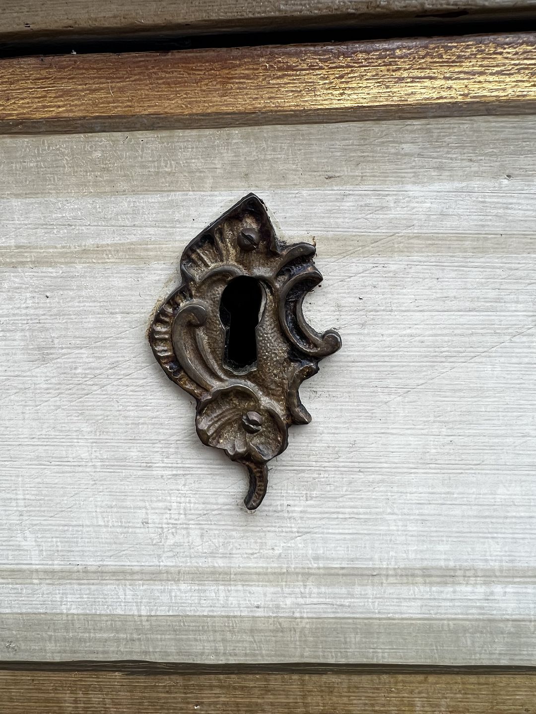 Kommode i bemalet træ med patina i lyse farver med udsmykkede håndtag og 5 skuffer fra omkring år 1890'erne.
