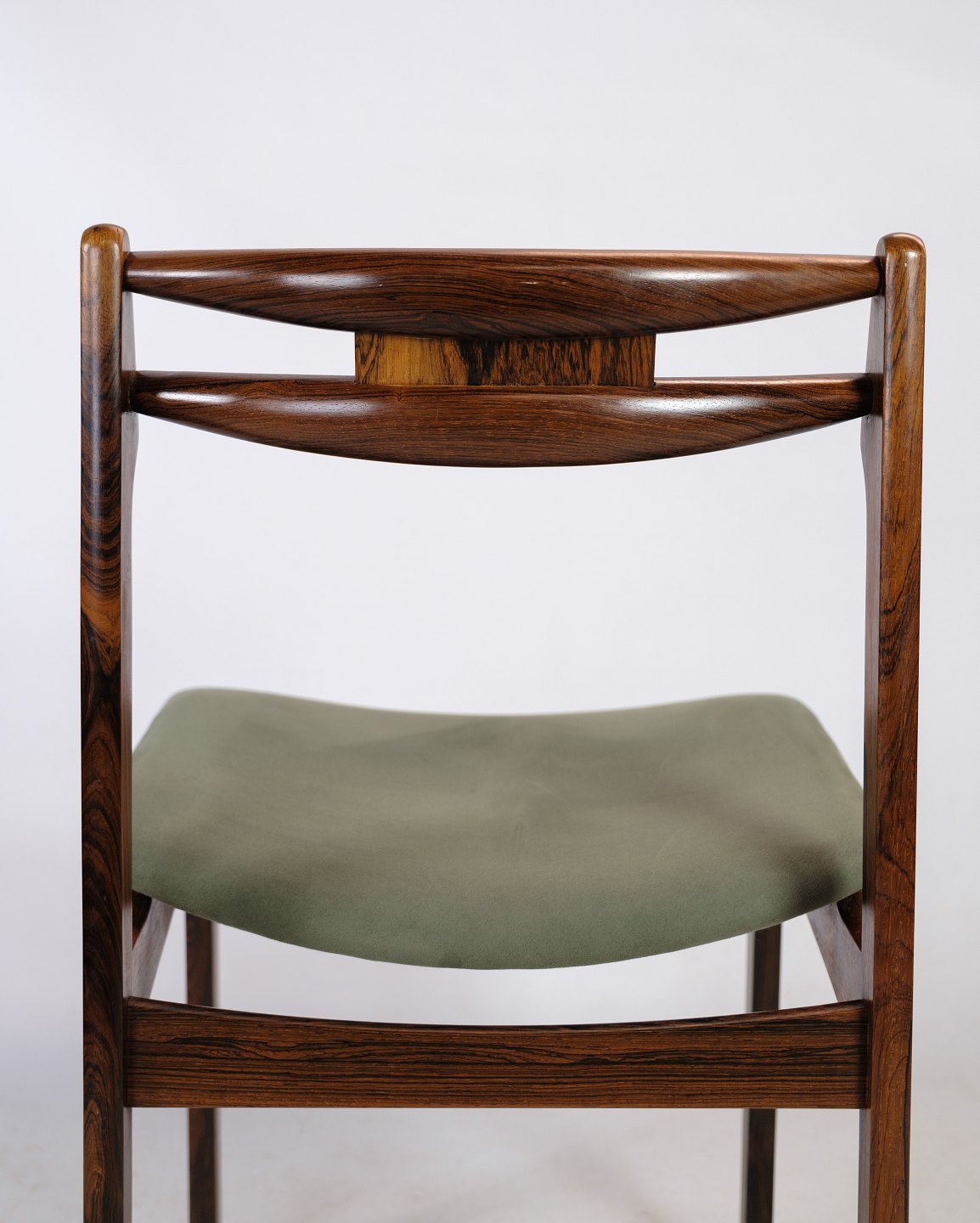 Sæt af 12 spisestuestole af palisander med grønt stof fra omkring 1960'erne. Et sæt stole af høj kvalitet og håndværksmæssig arbejde. De står alle i meget fin stand i både stof og træ. Sjældent udbudt.