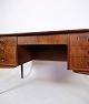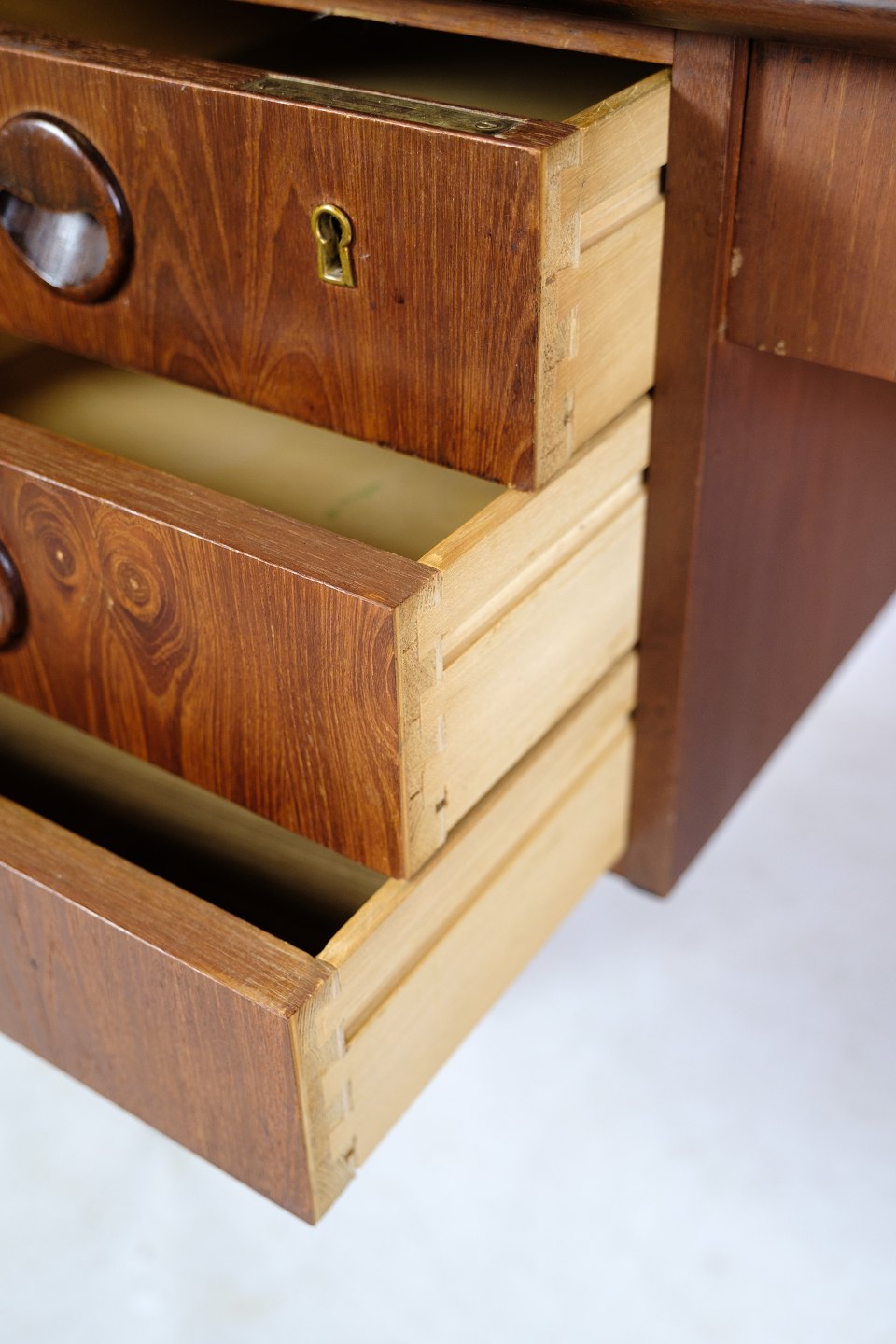 Skrivebordet har tre rummelige skuffer på hver side og en ekstra skuffe i midten, hvilket giver rigelig opbevaringsplads til dine kontorartikler og dokumenter. Den varme tone af teaktræet tilføjer en naturlig skønhed til rummet, mens det danske design bringer en tidløs elegance.