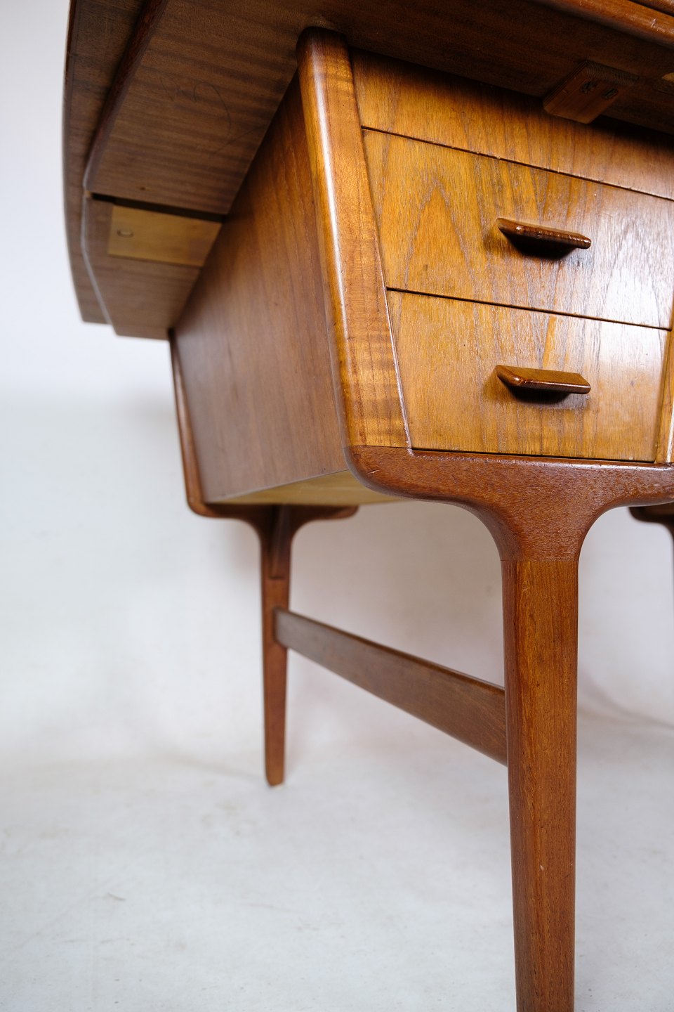 Created around the 1960s, this teak desk from Finland exudes a unique and remarkable aesthetic. It is a beautiful example of Finnish design and innovation from that time.
