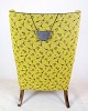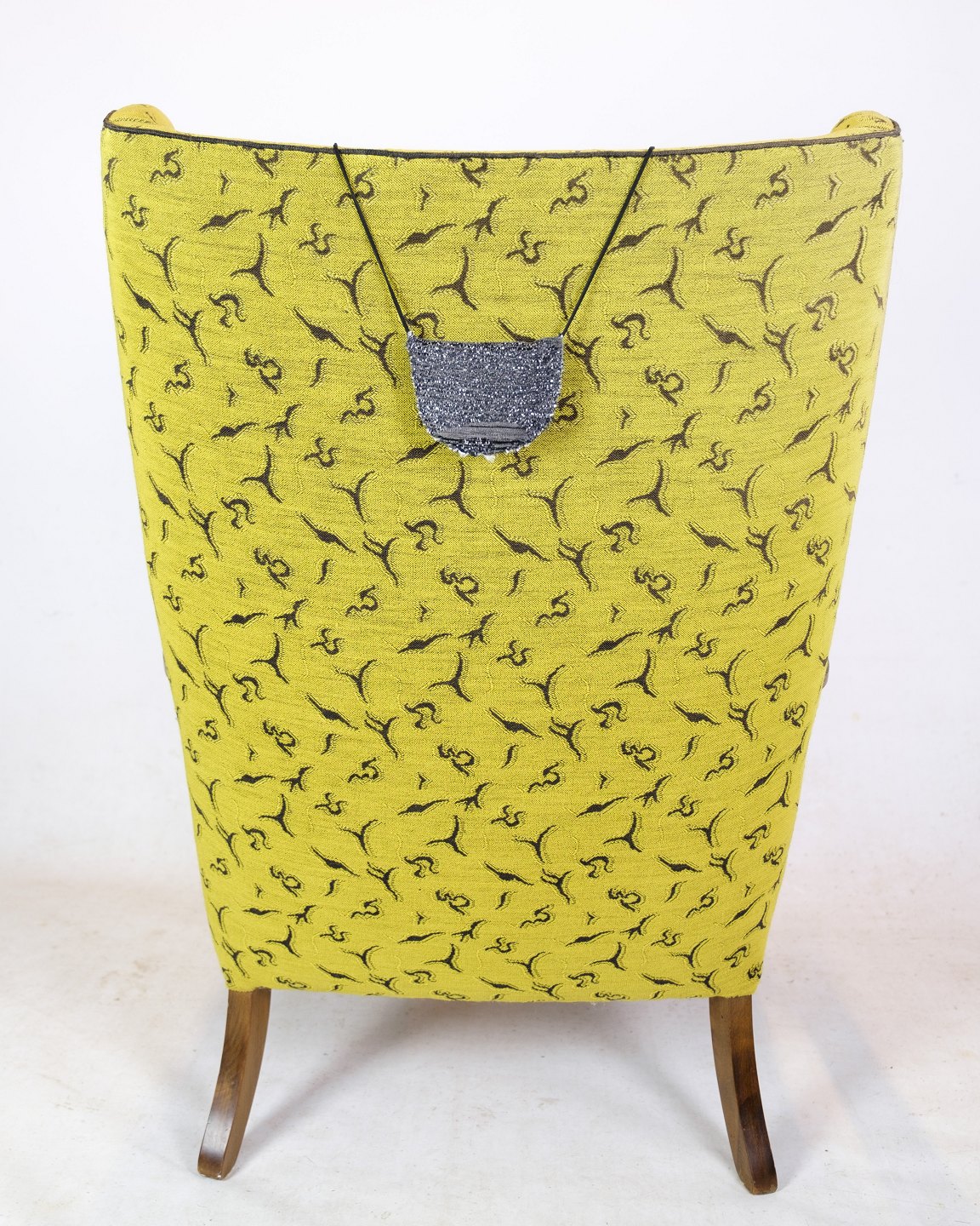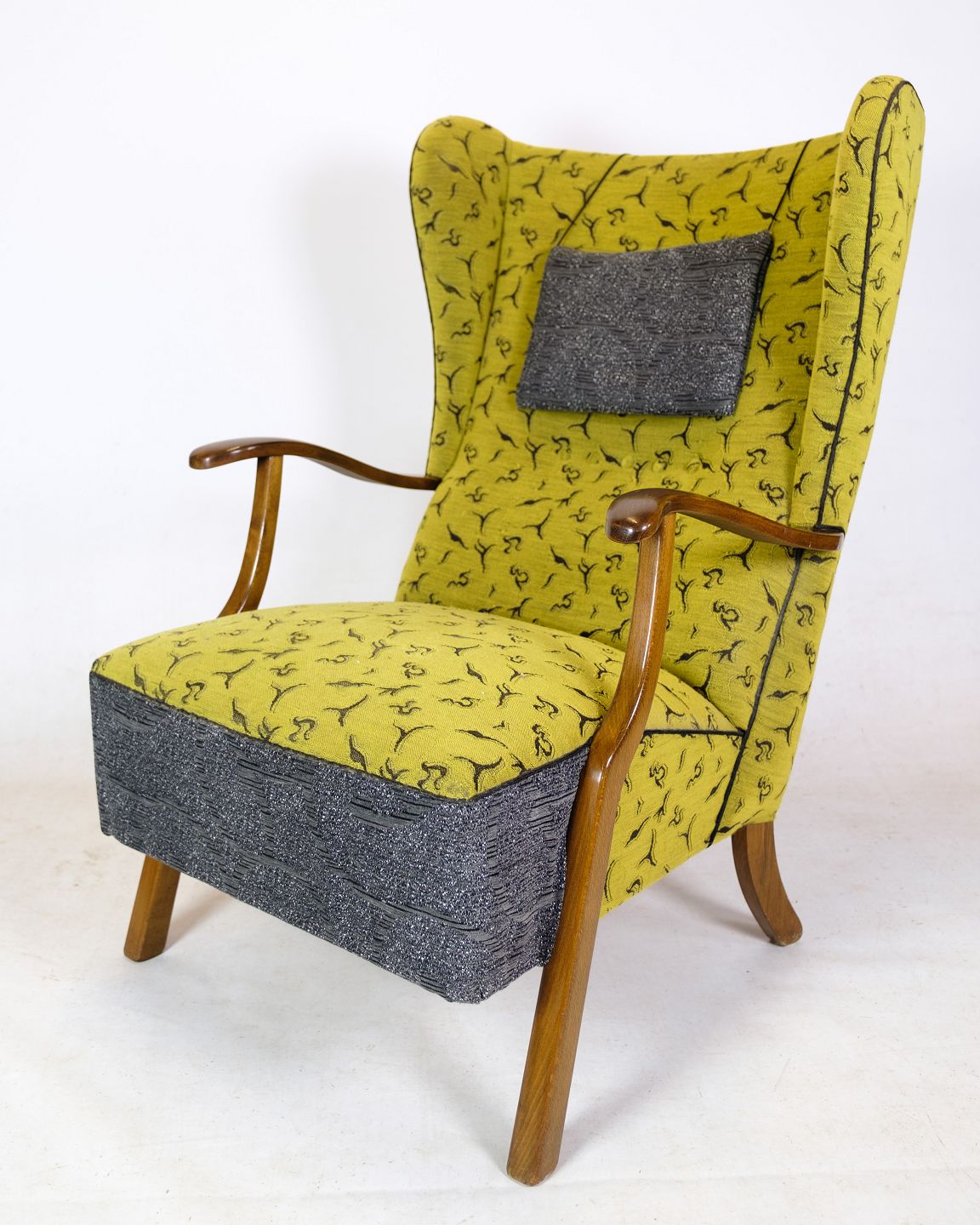 Lænestol af dansk snedkermester i mørkt poleret træ polstret i gråt og gult mønstret stof fra omkring 1940'erne.