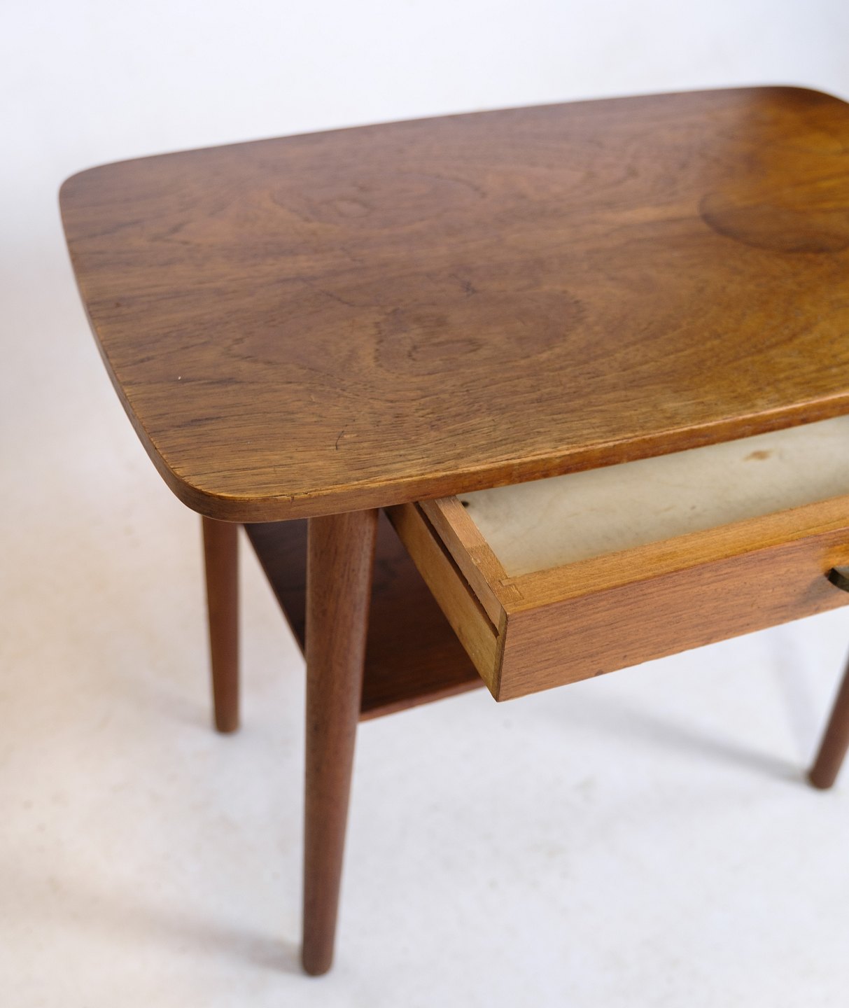 SolgtSidebord / natbord med skuffe og hylde i teaktræ af dansk design fra omkring 1960'erne.