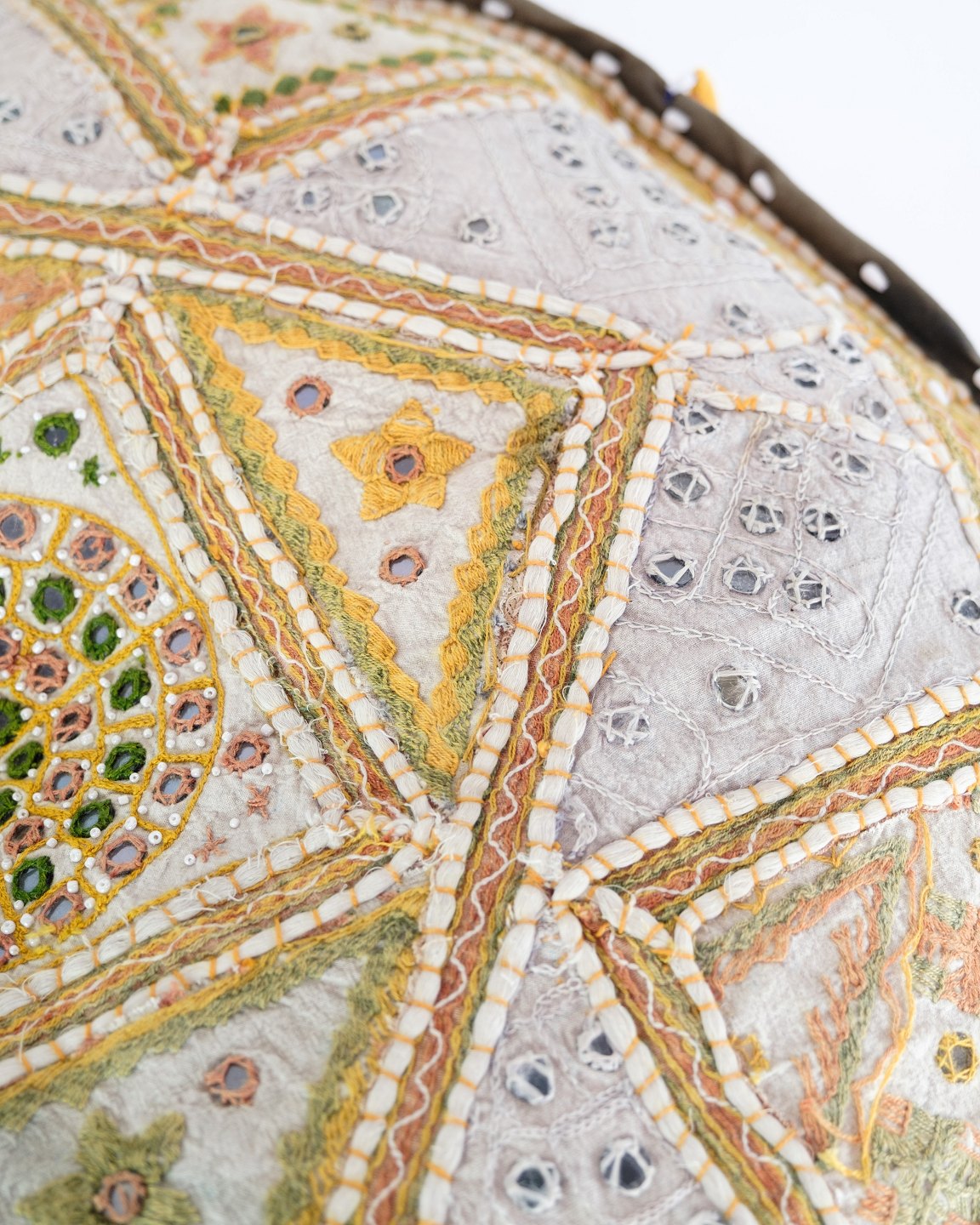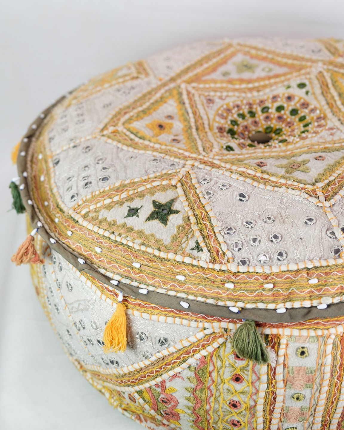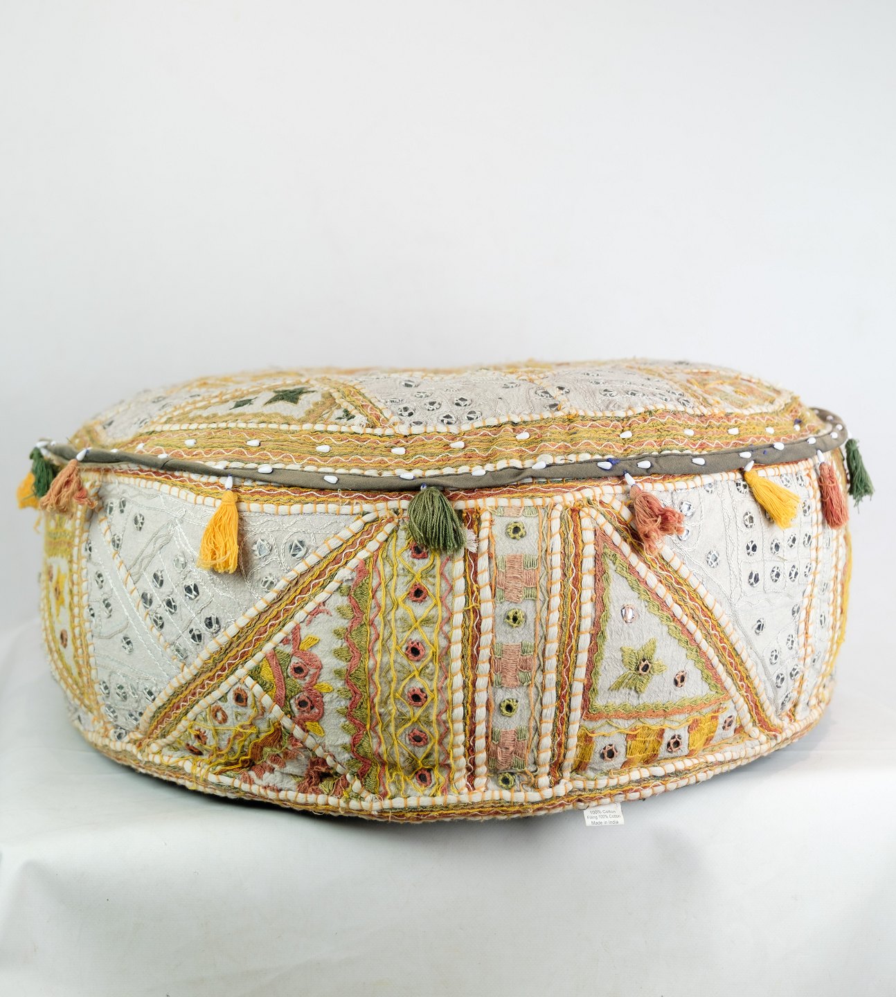 This ottoman of Indian origin is a unique and colorful addition to any home. With its combination of white and yellow colors, it brings a touch of exotic flair and warmth to any room. The handmade quality and the detailed patterns give the pouf an authentic look that reflects Indian craft tradition.