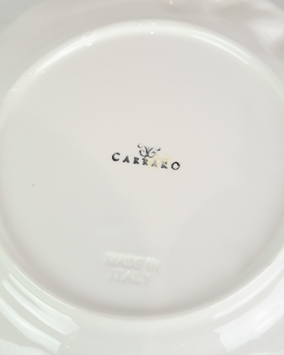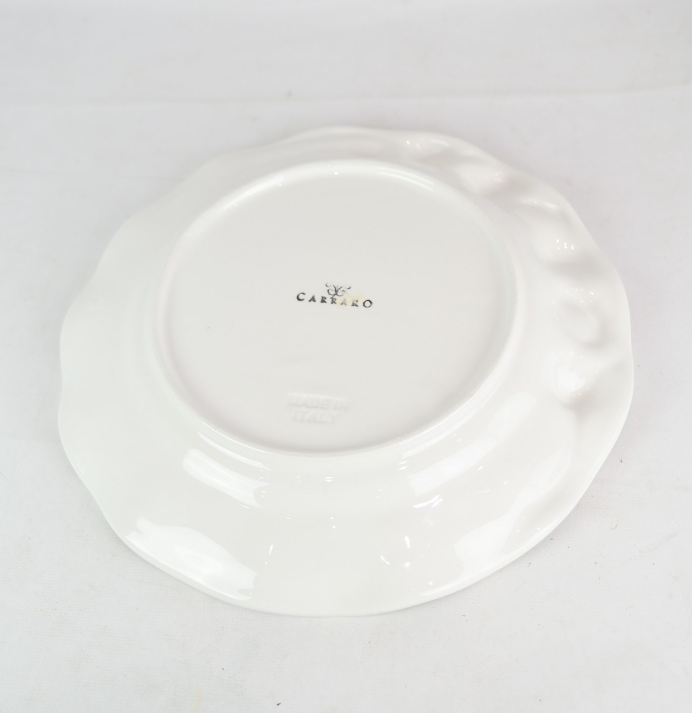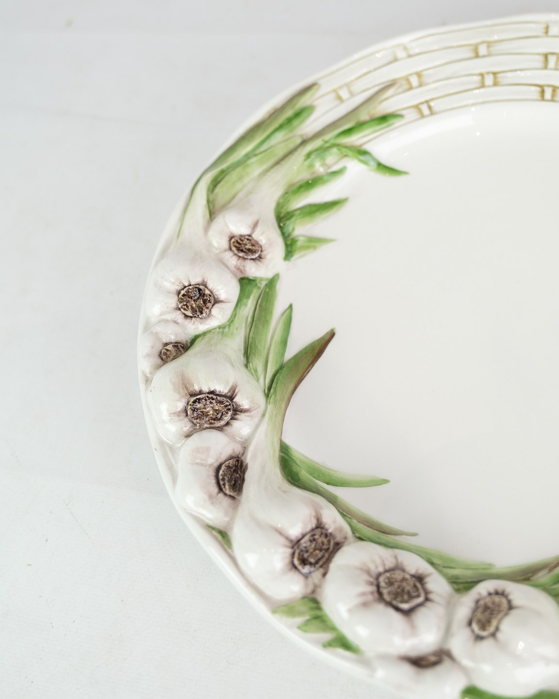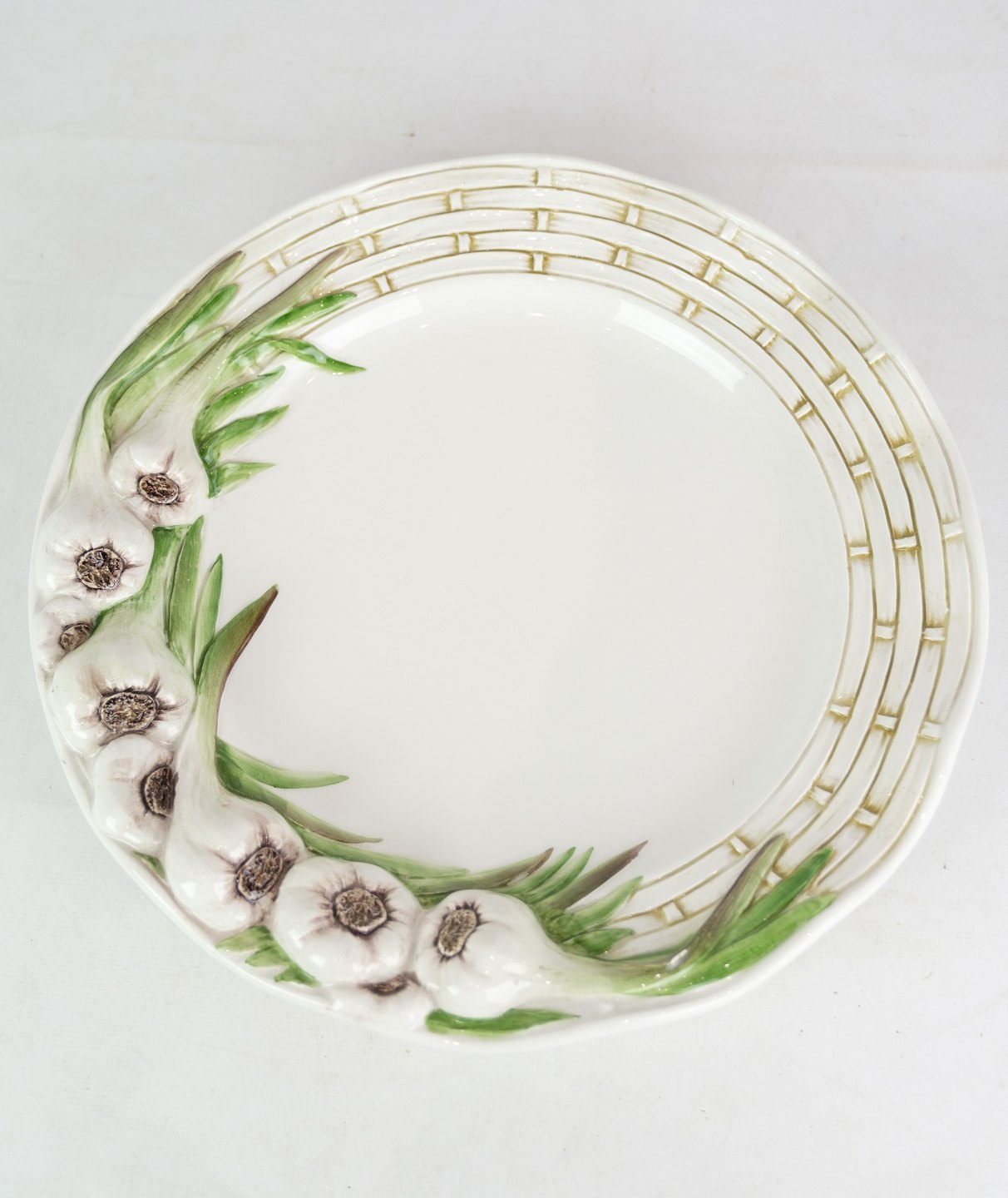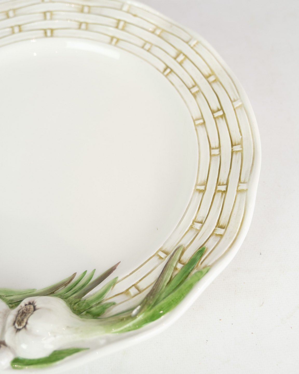 Hvide porcelæns tallerkener, dekoreret med hvidløg i Italiensk design. Står i flot stand uden skader. (Flere på lager, spørg efter antal)