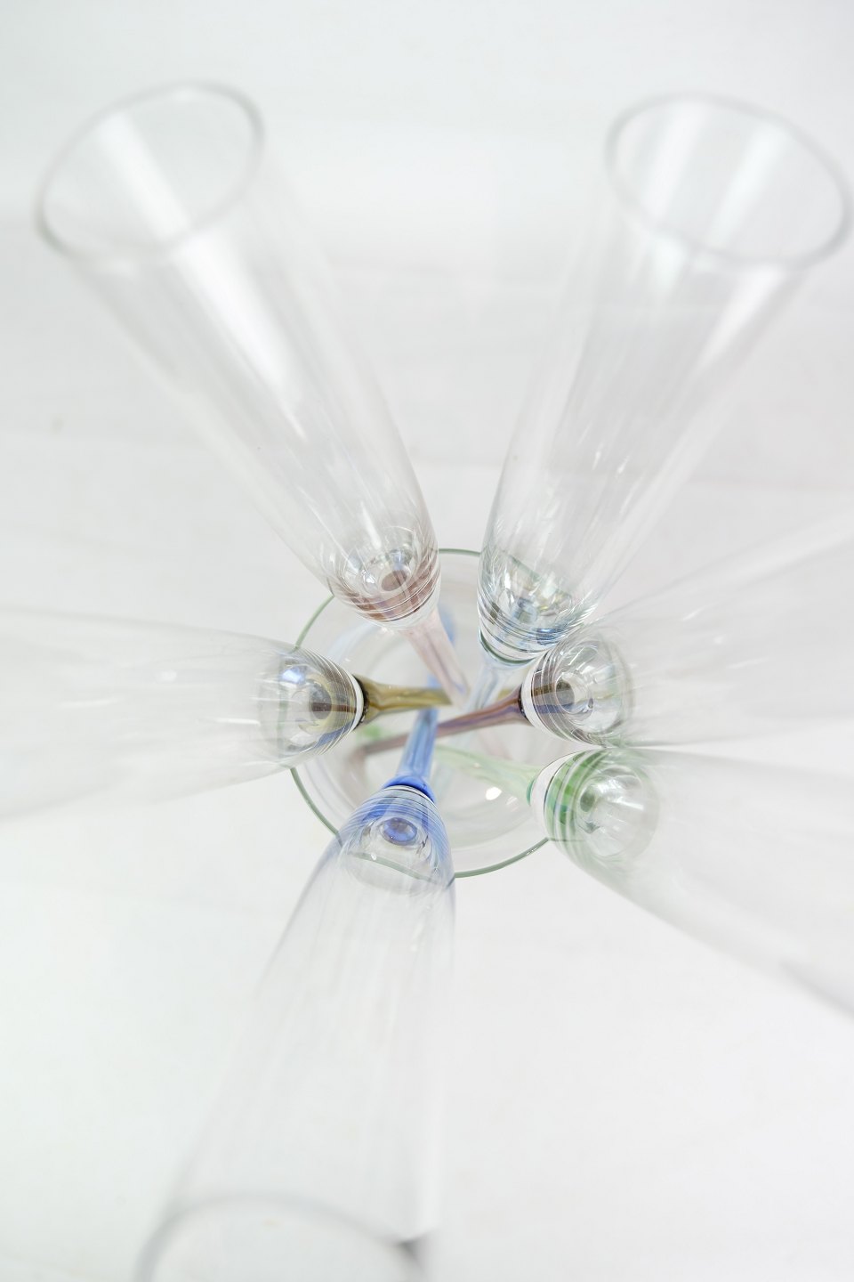 SolgtServerings glas vase med champagne glas på stilk med forskellige farver. Sælges som sæt.