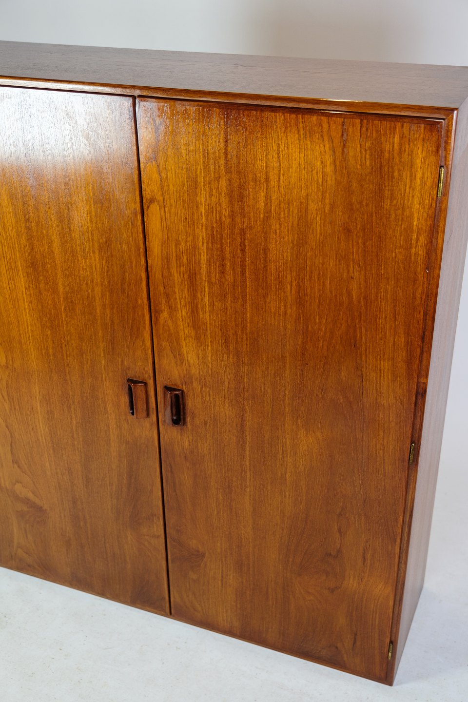 Dette hængeskab af Børge Mogensen, fremstillet i teaktræ i 1950'erne, er et smukt eksempel på dansk design fra midten af det 20. århundrede. Mogensen var kendt for sit enkle og funktionelle design, og dette skab er ingen undtagelse.