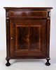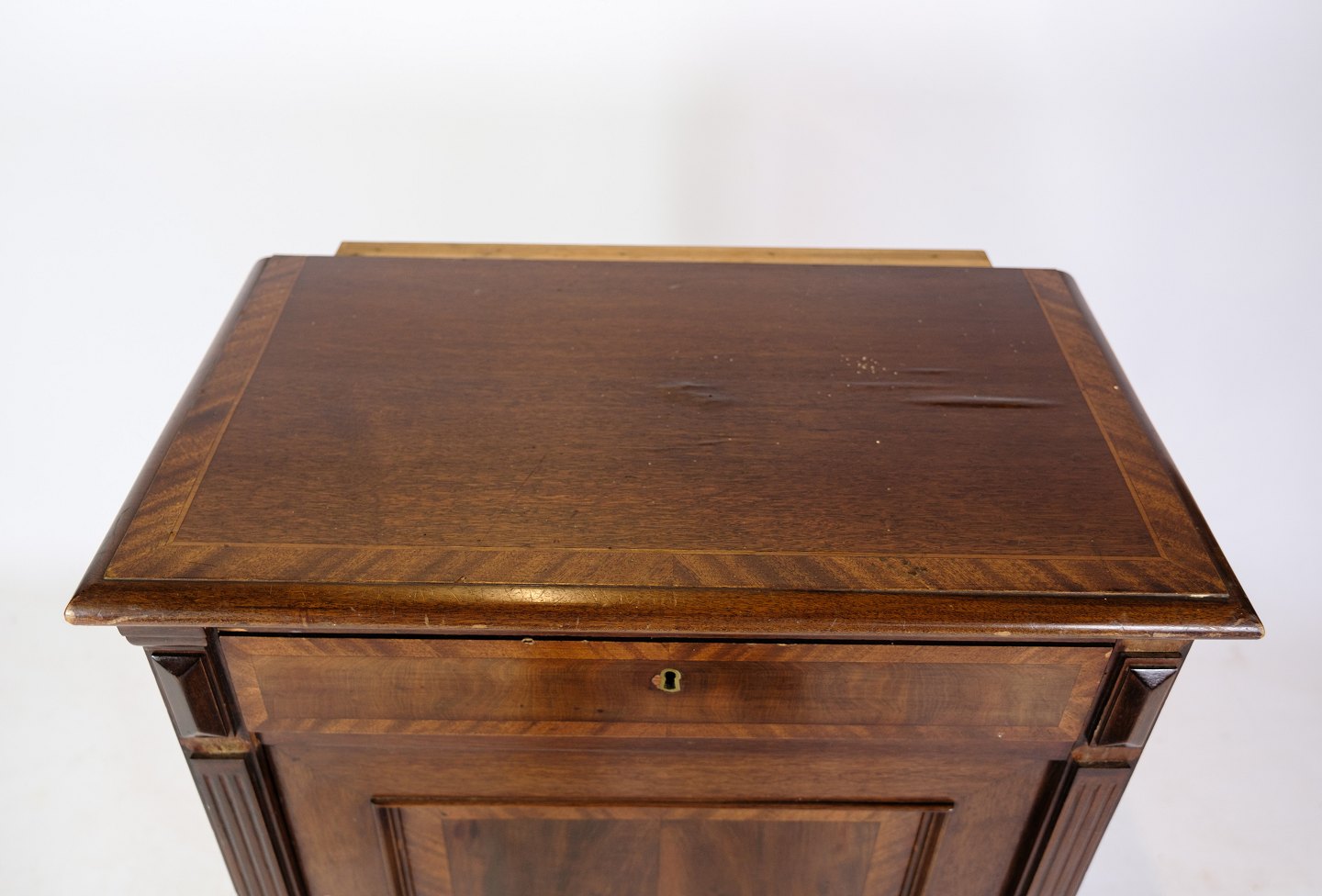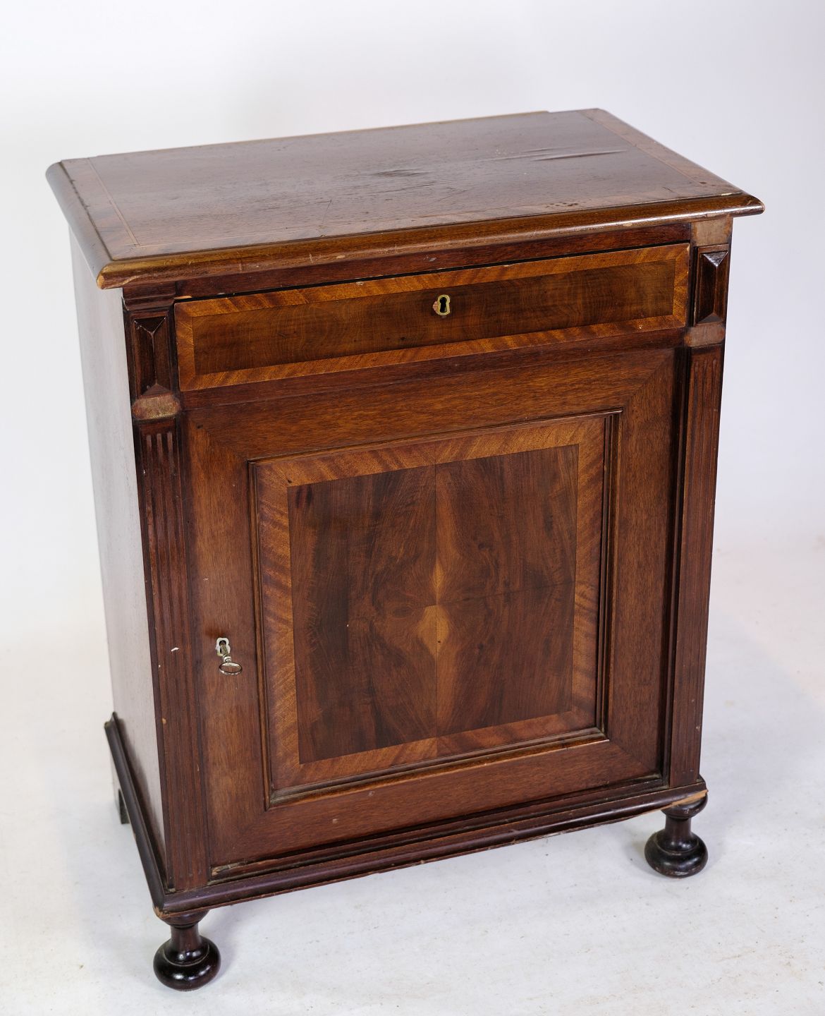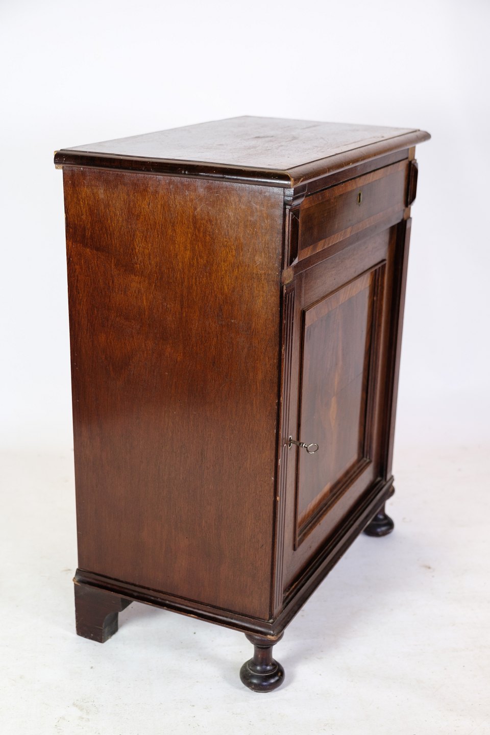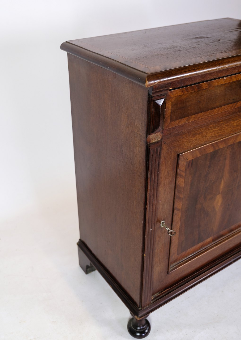 SoldMahogany console with inlaid walnut wood and round legs from around the 1880s.