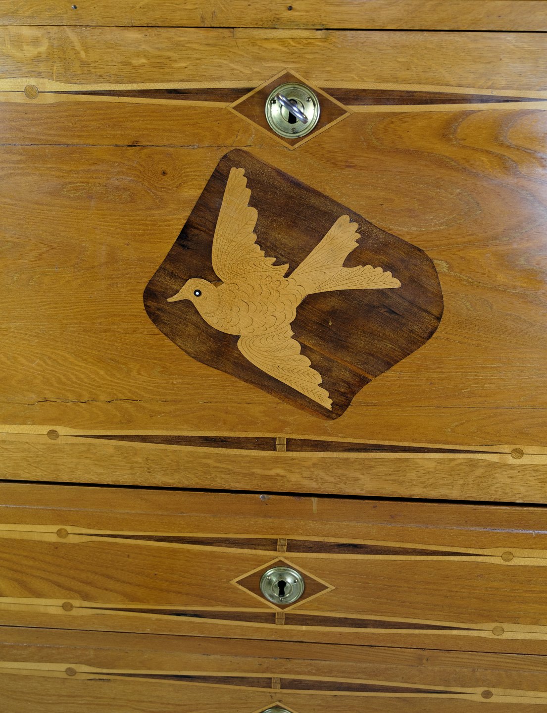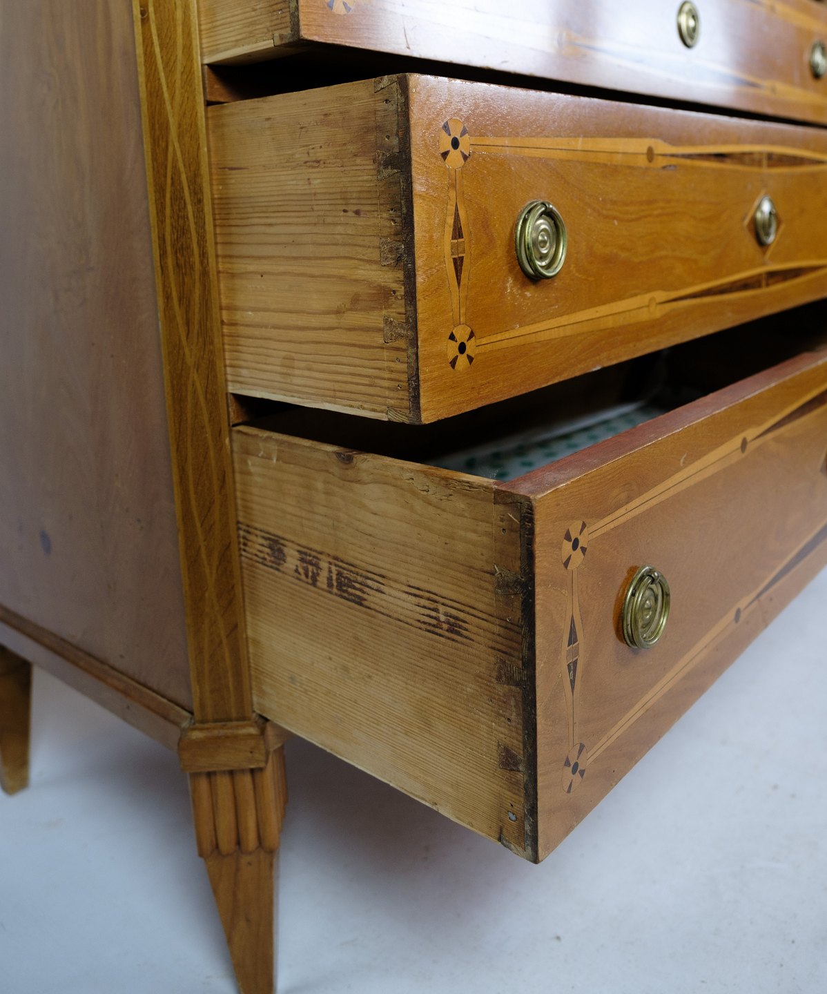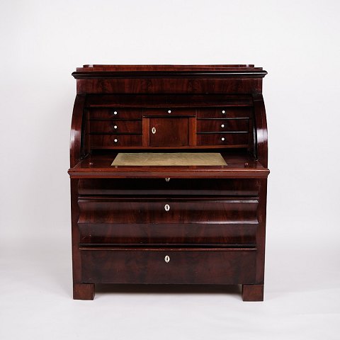 Sekretær af lyst mahogni udsmykket med dekorationer af Intarsia af frugt træ og messing håndtag fra omkring 1810'erne.
