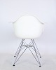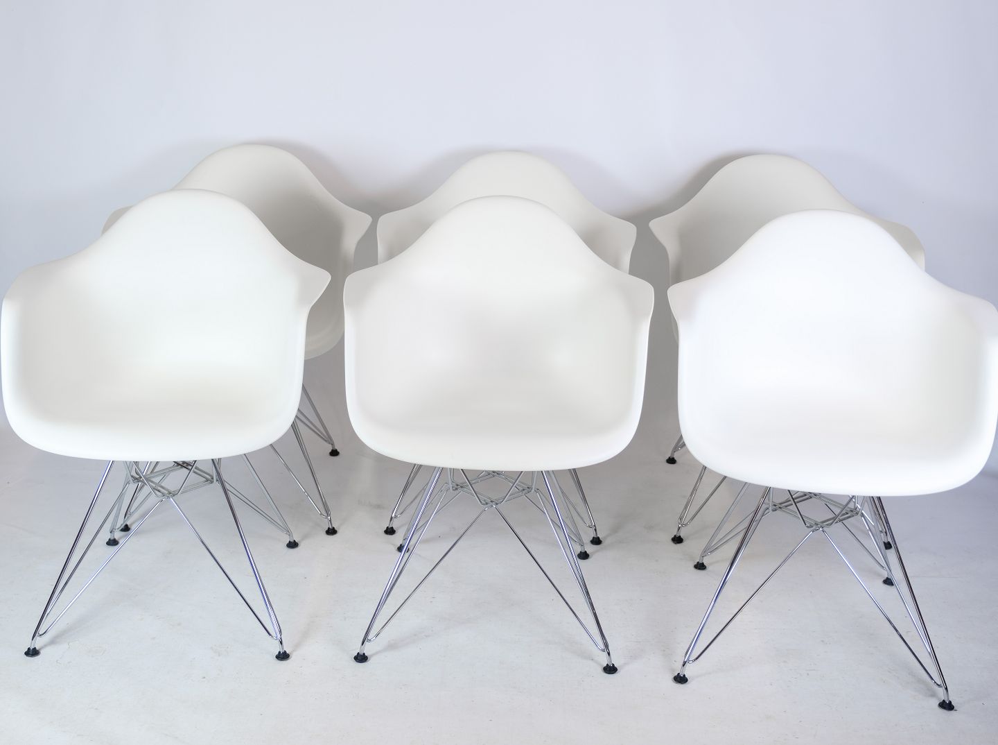 Dining room chairs, Model DAR, designed by Charles & Ray Eames made by Vitra in white hard plastic with chrome frame.