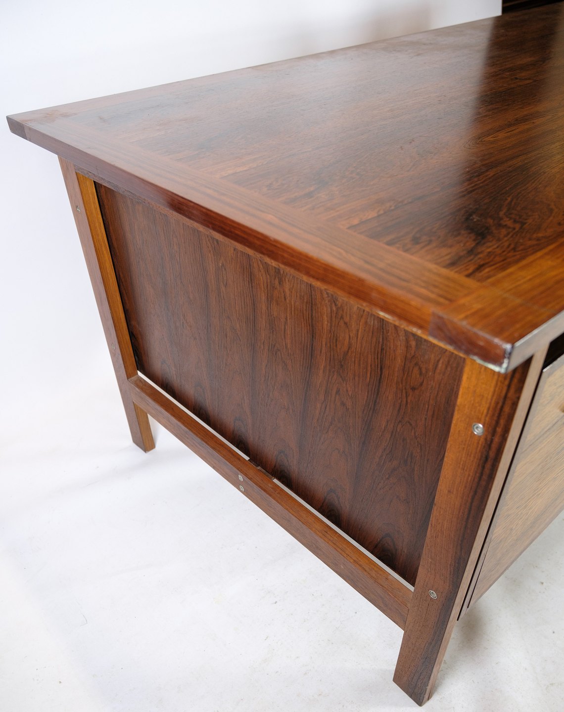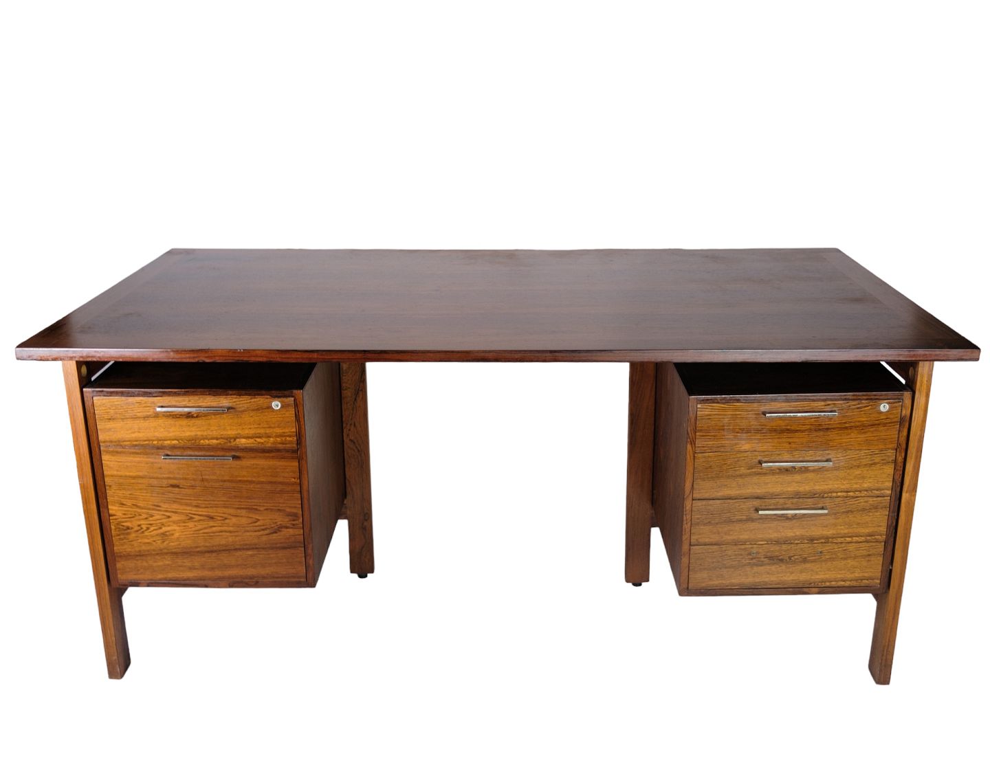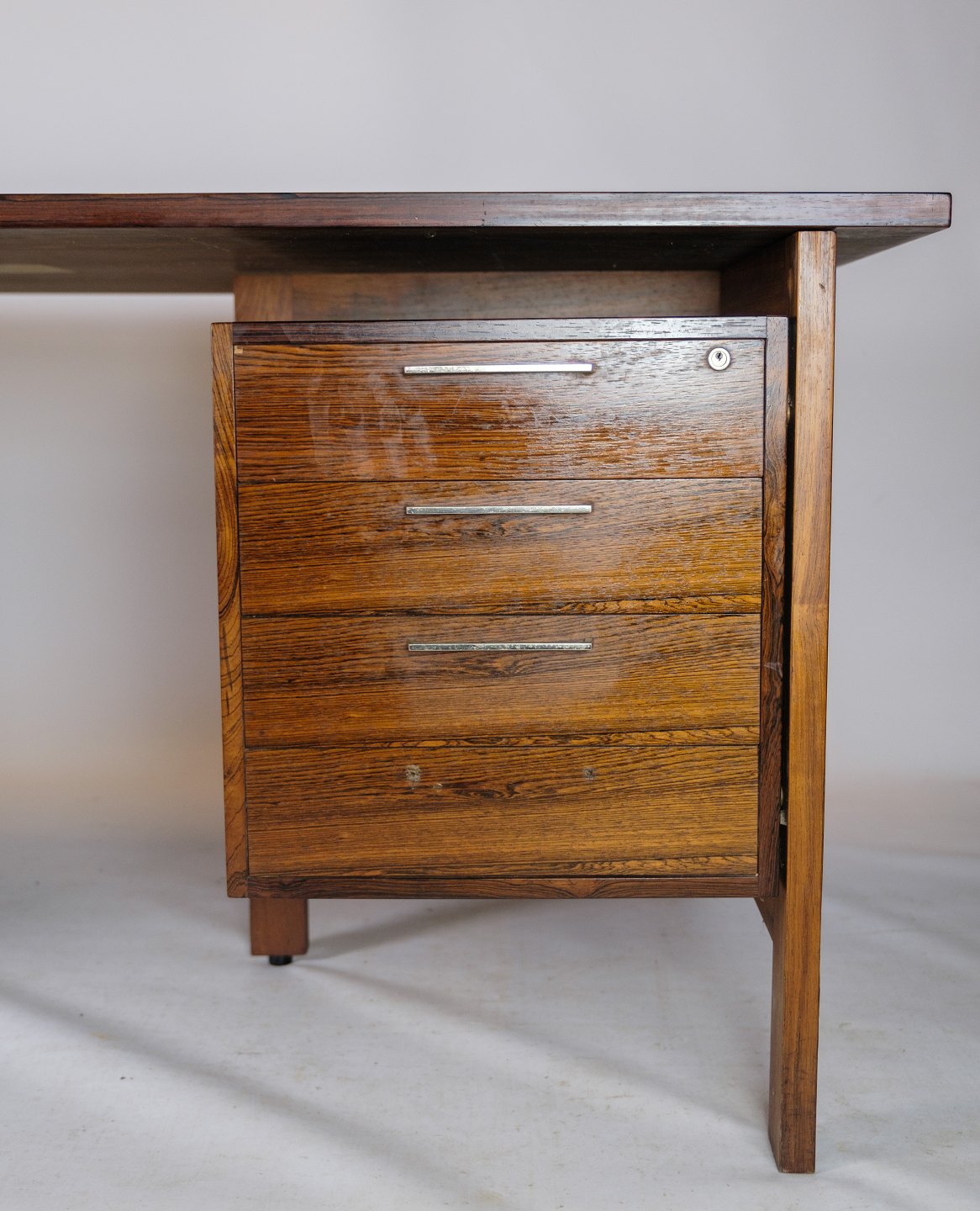 Med sin charmerende og funktionelle udformning tilbyder skrivebordet både skuffer og hylder, hvilket gør det ideelt til opbevaring af dokumenter, kontorartikler og andre nødvendigheder. Den rige farve og struktur i palisandertræet tilføjer desuden en varm og luksuriøs følelse til ethvert arbejdsområde.