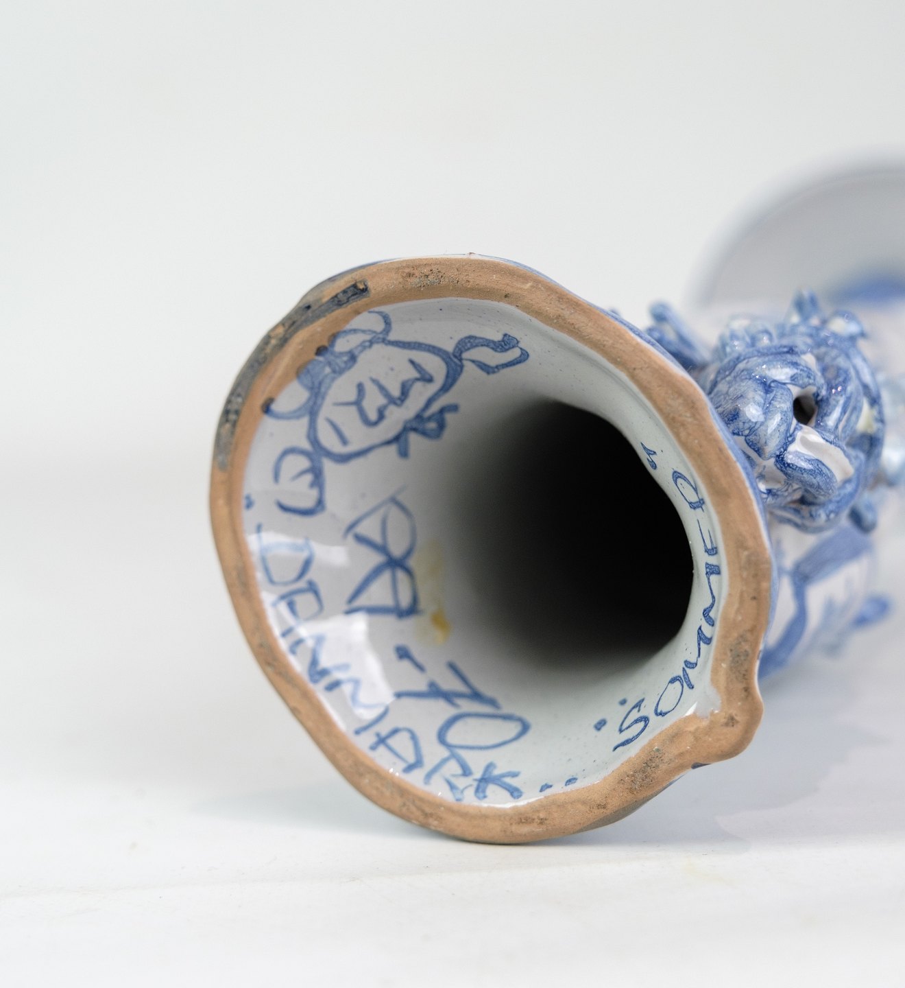 Figuren "Sommer" M21, dekoreret i blå og hvide farver, repræsenterer sandsynligvis sommersæsonen med sin egen unikke og fantasifulde tolkning. Med sine mål på 35 cm i højden og en diameter på 8,5 cm, er denne figur en imponerende og iøjnefaldende dekoration.