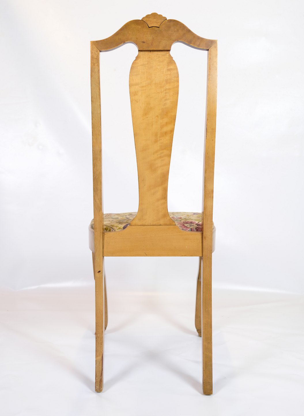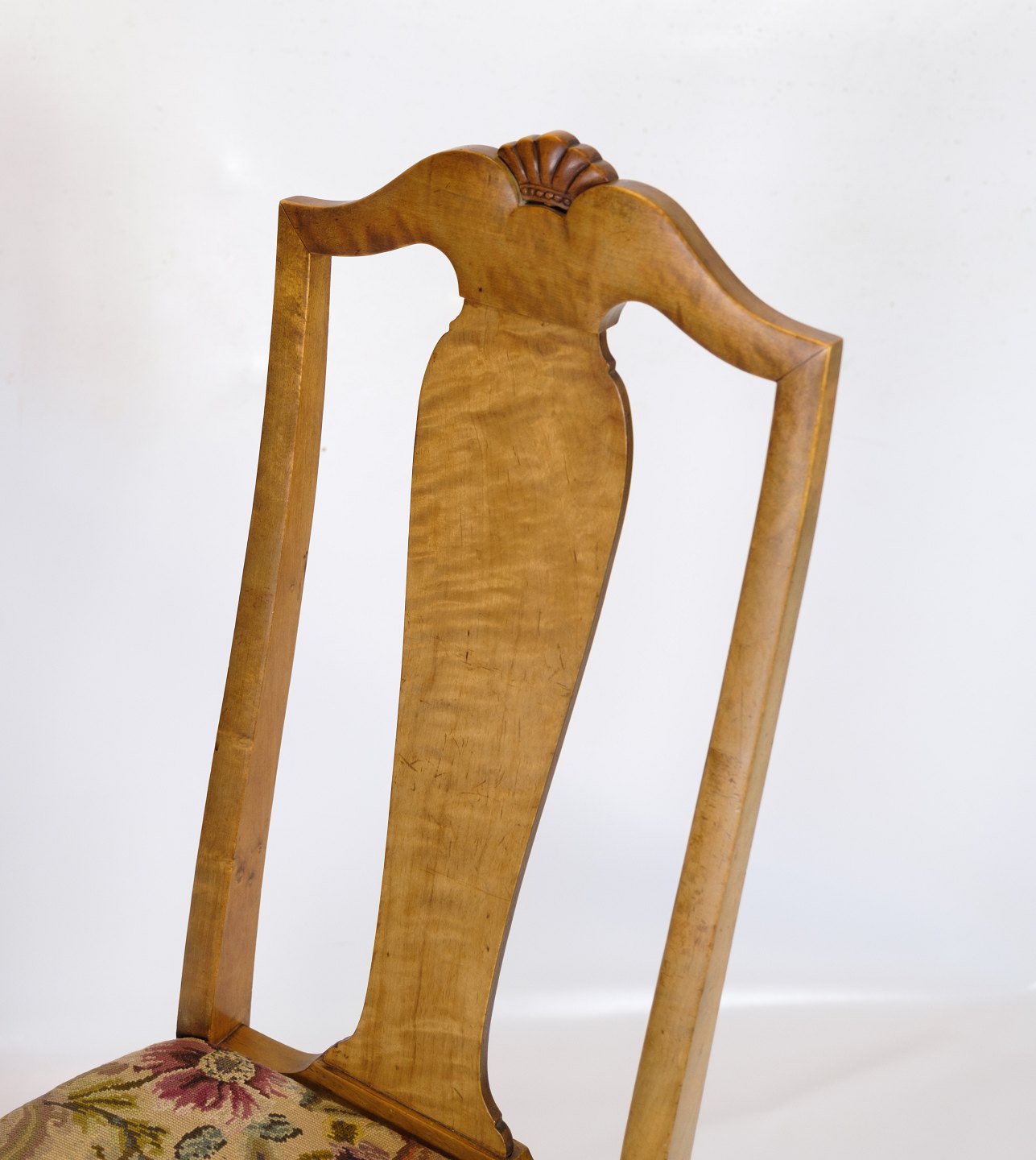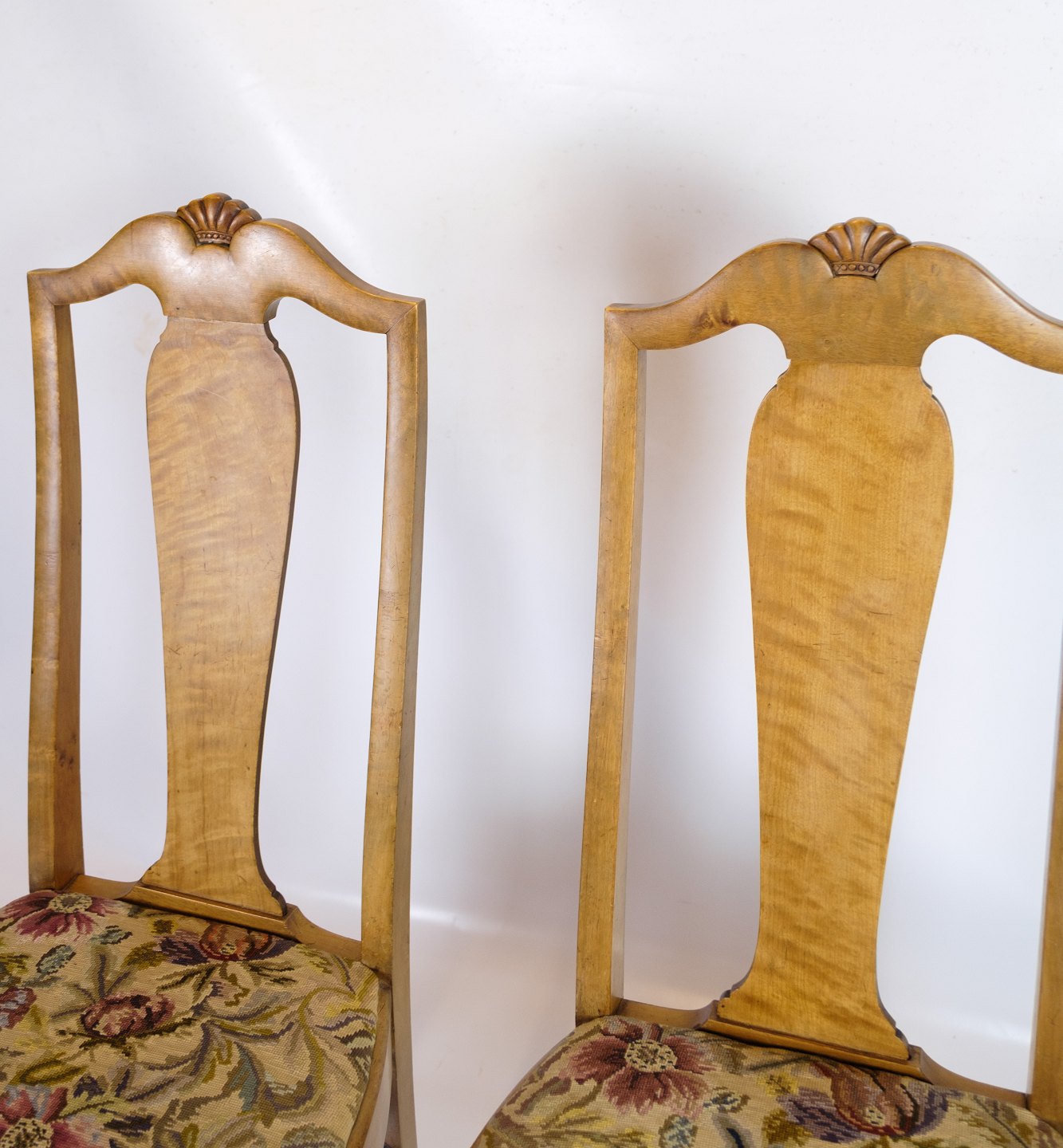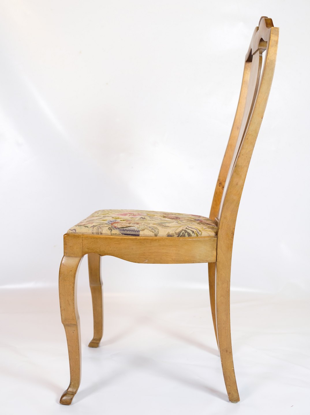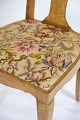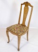 Antique dining room chairs in light mahogany with light fabric upholstery made in Rococo style from around the 1920s.