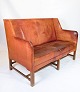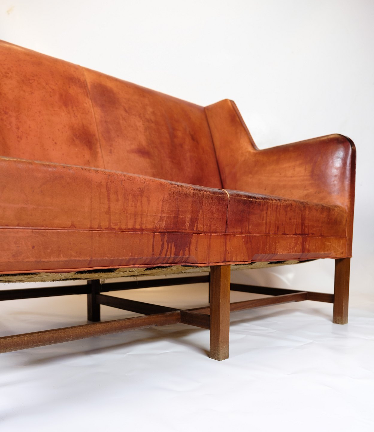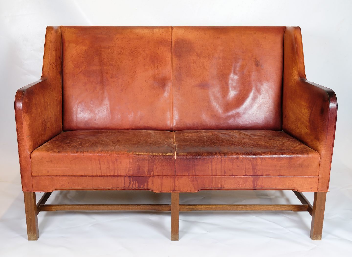 The vintage design two-seater sofa model 5011 created by Kaare Klint. This iconic piece is crafted in original cognac leather and features a distinctive six-legged mahogany base. The sofa gained recognition after being showcased at the Copenhagen Cabinetmakers' Guild exhibition in 1935, highlighting its significance in the history of Danish modern design.