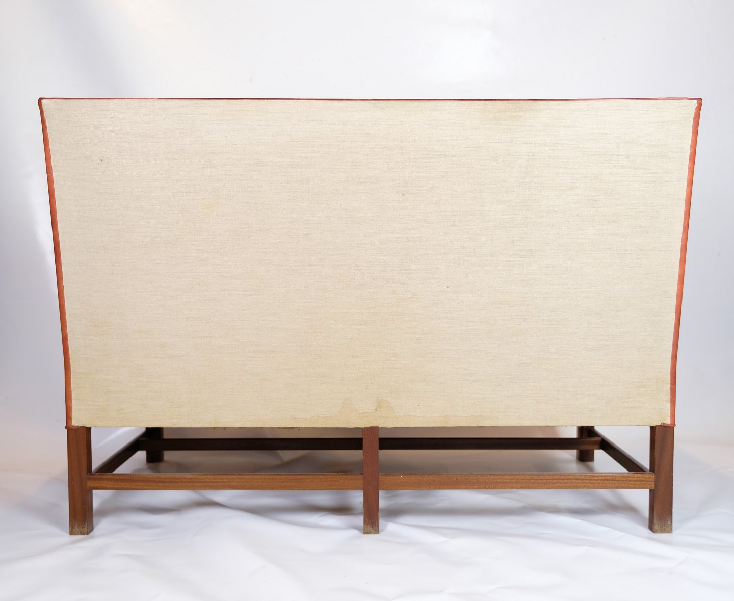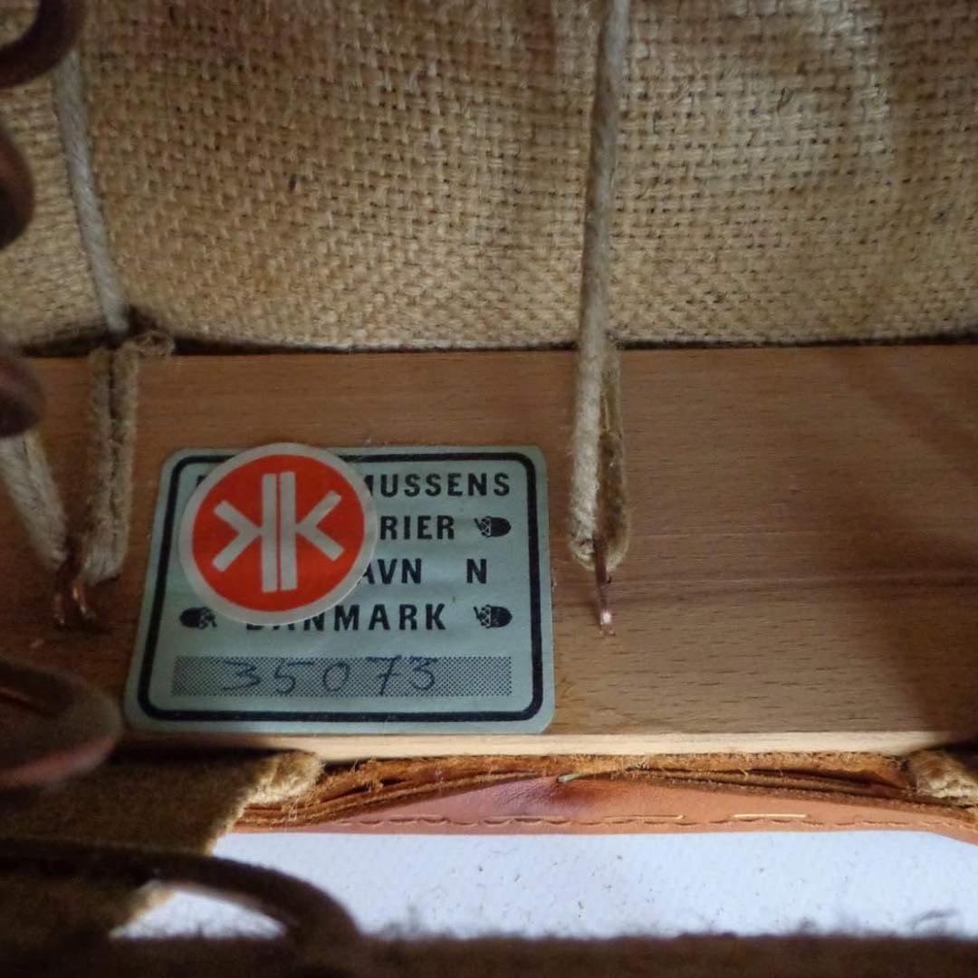 The sofa is signed with a decal manufacturer's label indicating its origin from (Rud. Rasmussens Snedkerier), a well-known Danish furniture manufacturer. This not only adds historical value to the piece but also confirms its authenticity.