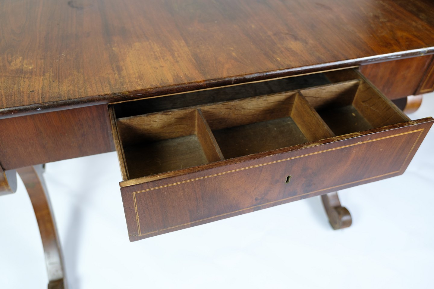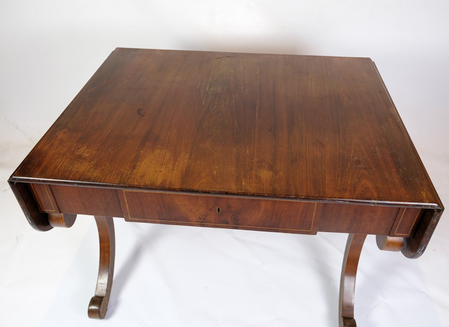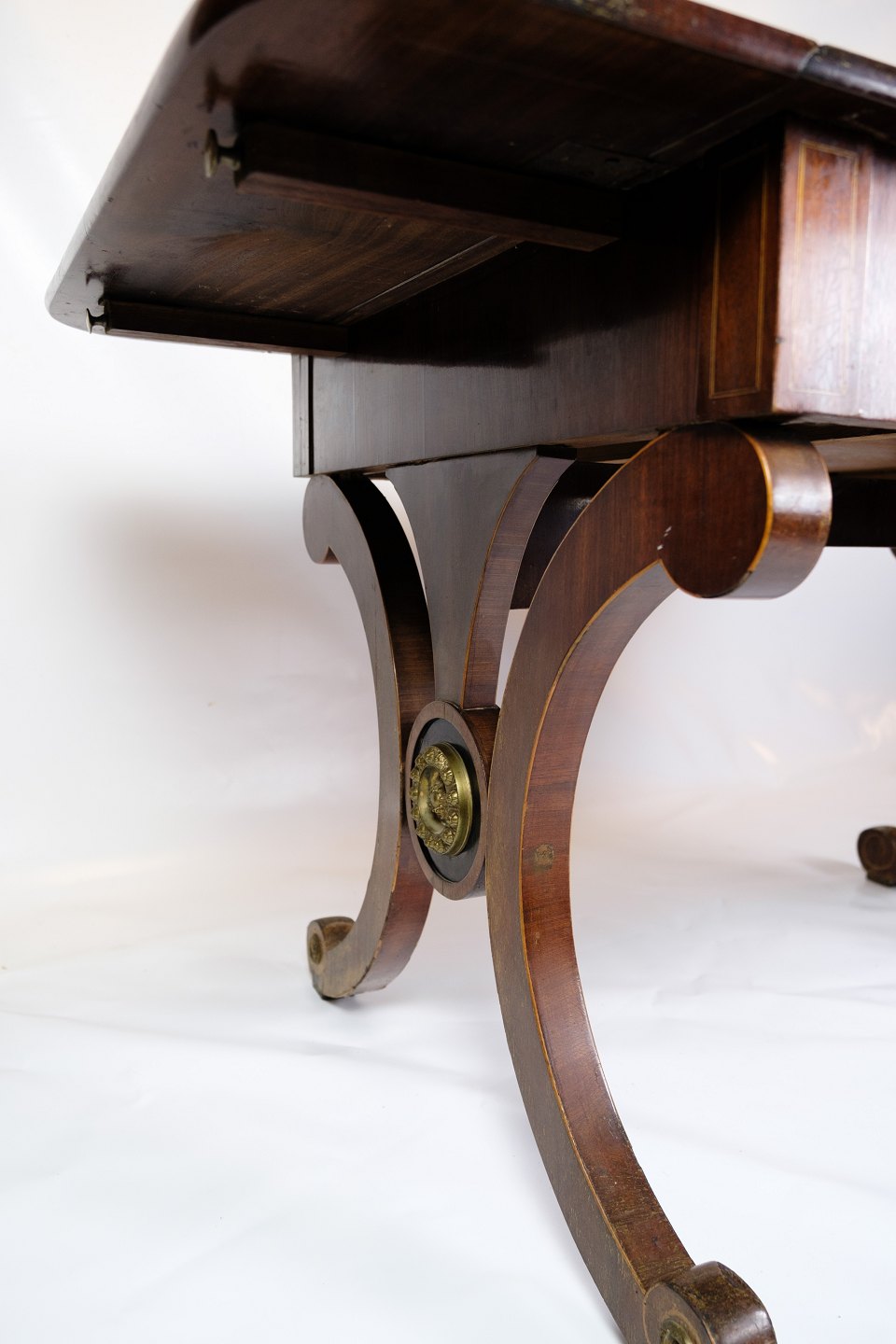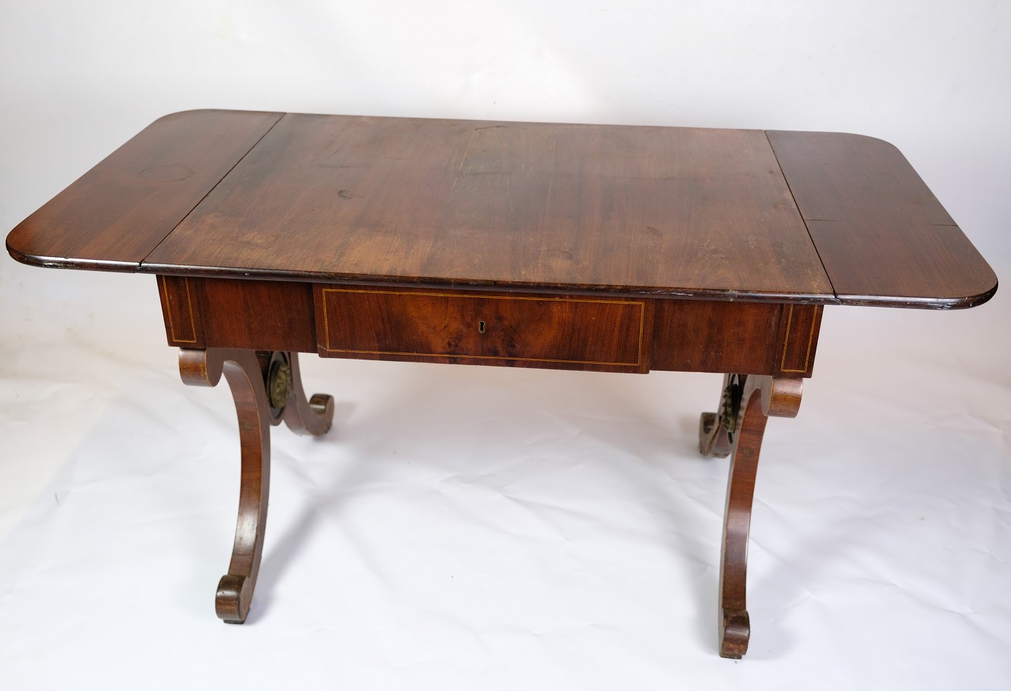 Spisebord af mahogni med klapper og messing udsmykning, samt en skuffe med nøgle fra omkring 1860'erne.
