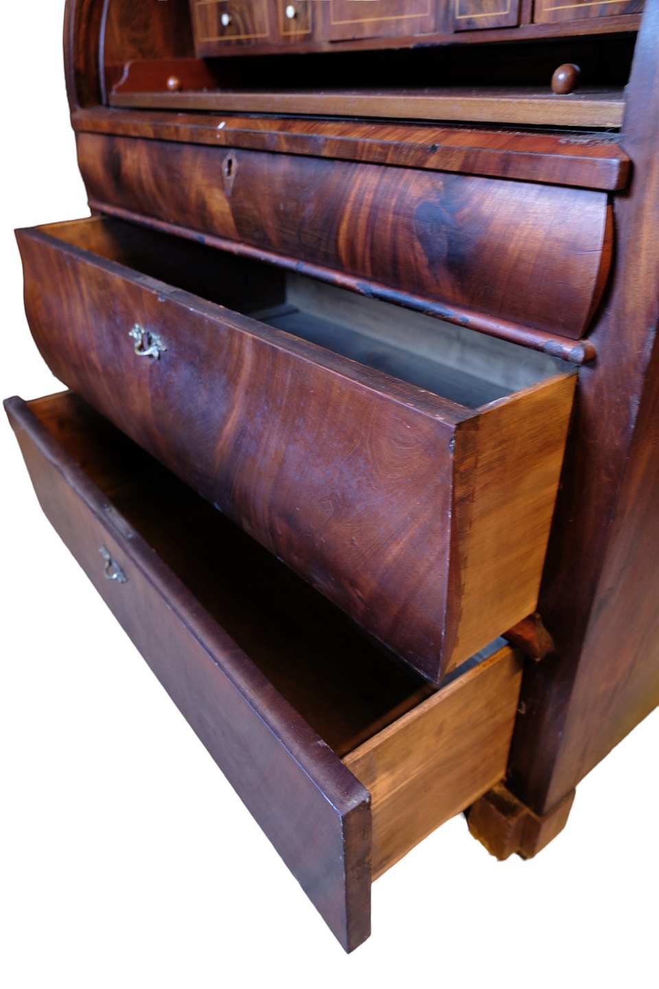 Chatol af Mahogni med fire skuffer og indvendig intarsia fra omkring år 1820'erne.