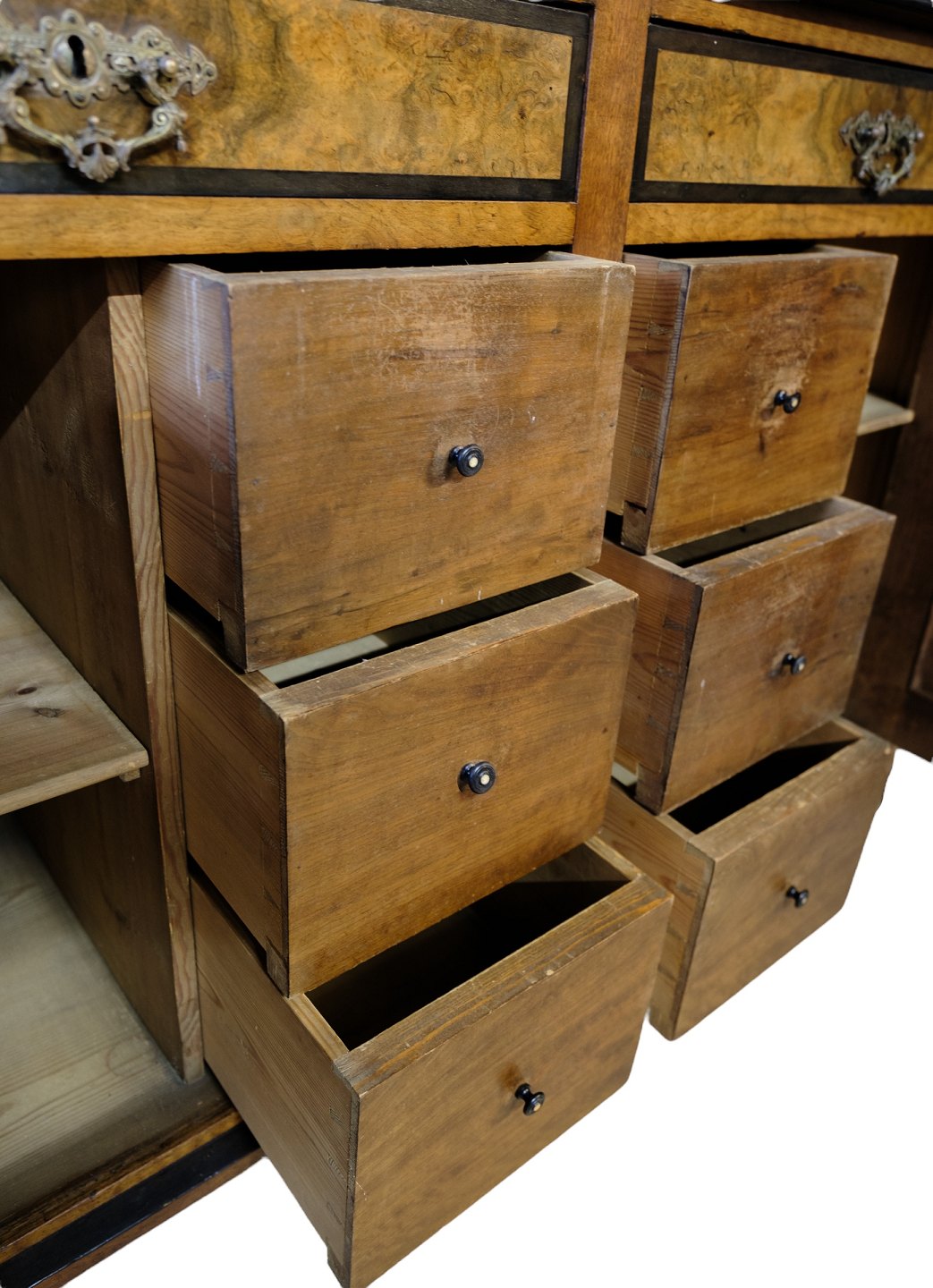 Skænk af lys mahogni med 2 låger og 2 skuffer og runde ben fra omkring 1920'erne.