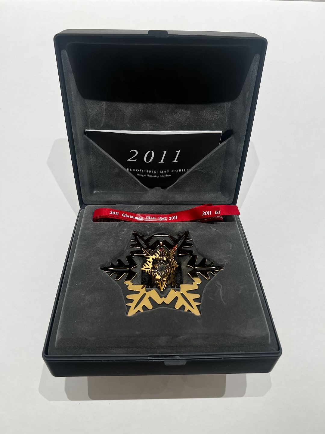 Georg Jensen's Christmas clock from 2011 has the motif "Snekrystal" and was designed by Flemming Eskildsen. The watch is made of gilded brass.