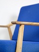Hynderne, der er beklædt med blåt stof, tilføjer en ekstra dimension af komfort og stil til gyngestolen, samtidig med at de skaber en smuk kontrast til træets varme farver.