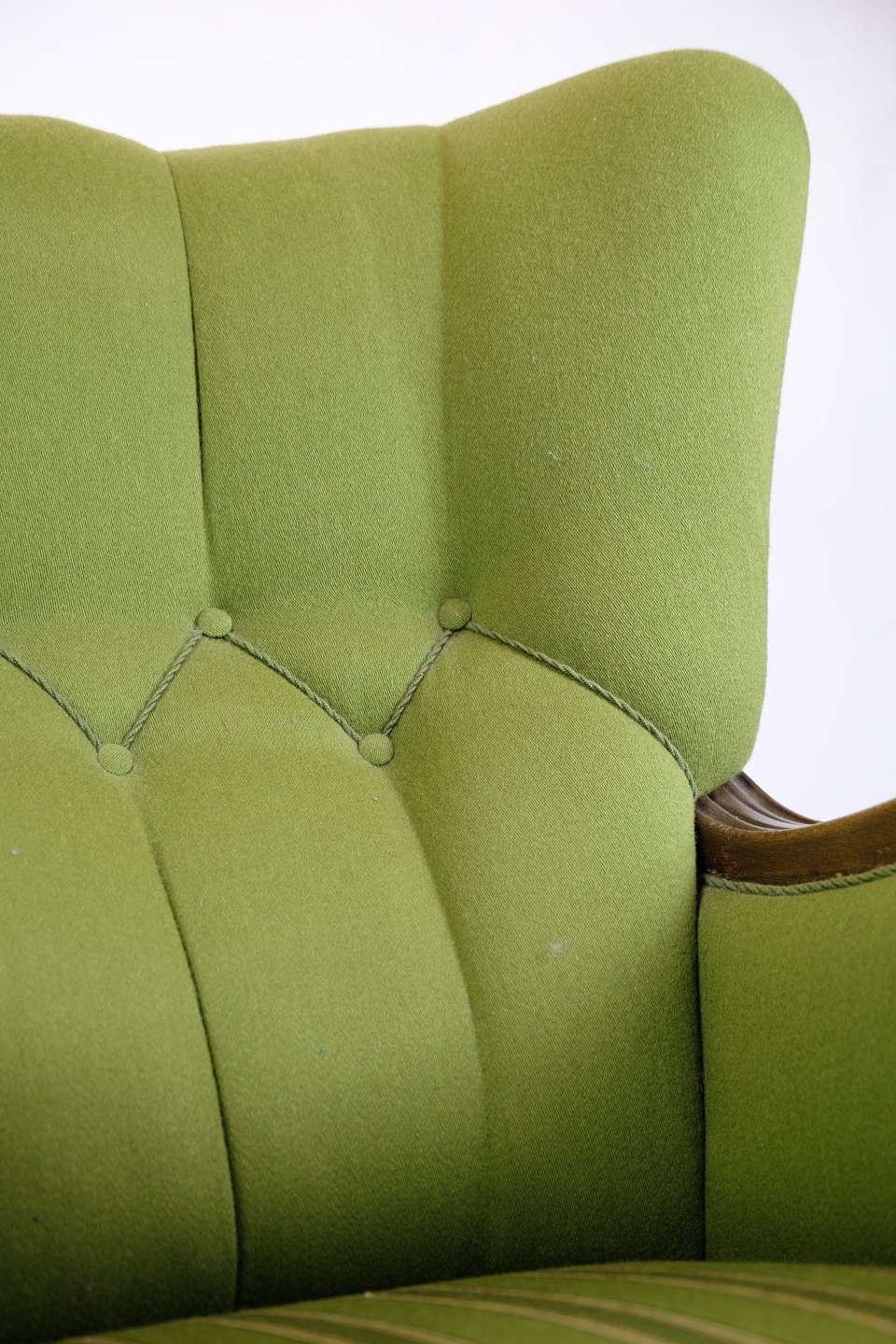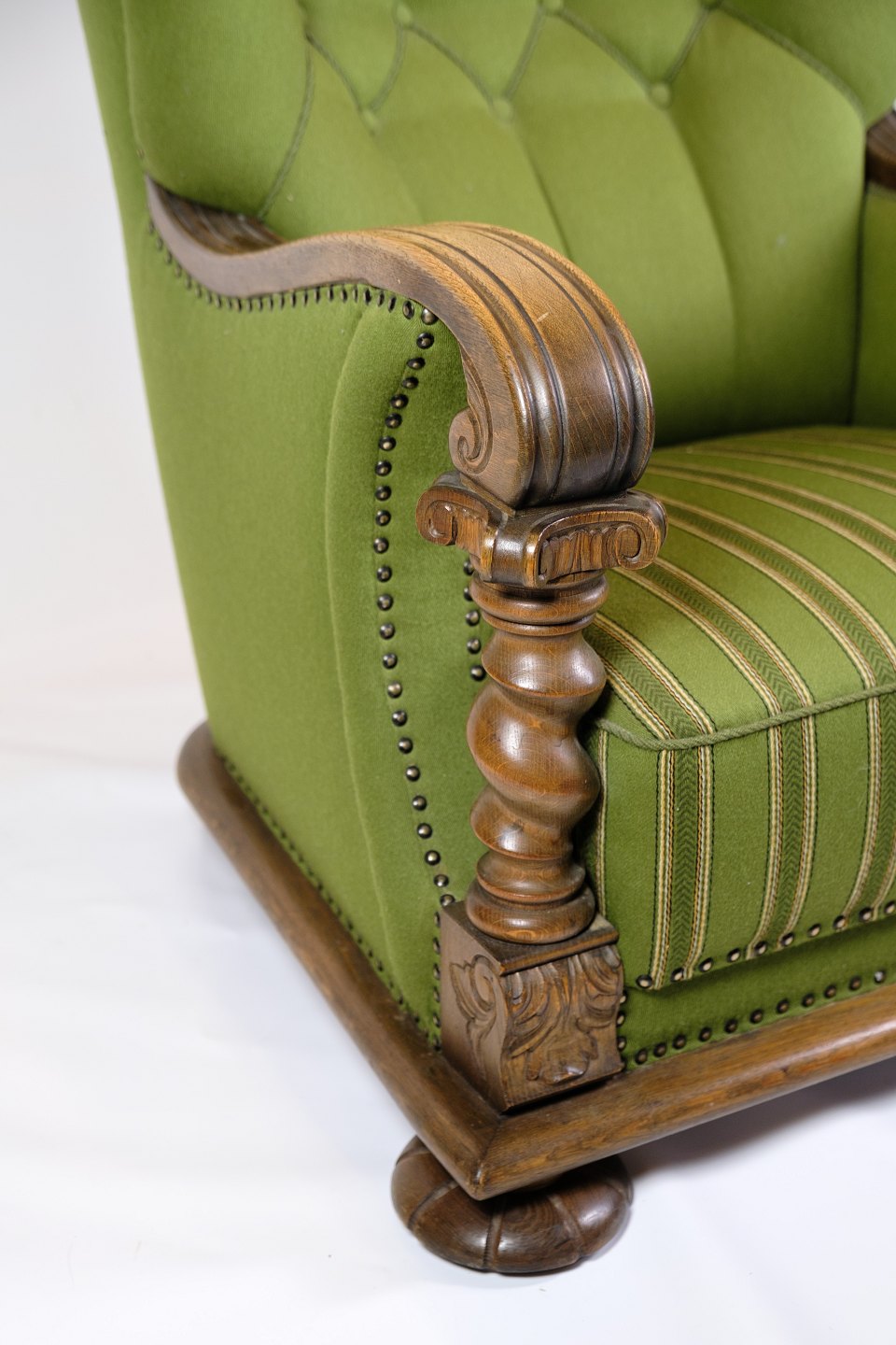 A high-backed armchair from the Renaissance period upholstered in green fabric and decorated with hand-crafted wood carvings from around the 1920s is an impressive piece of furniture craftsmanship with a timeless aesthetic.