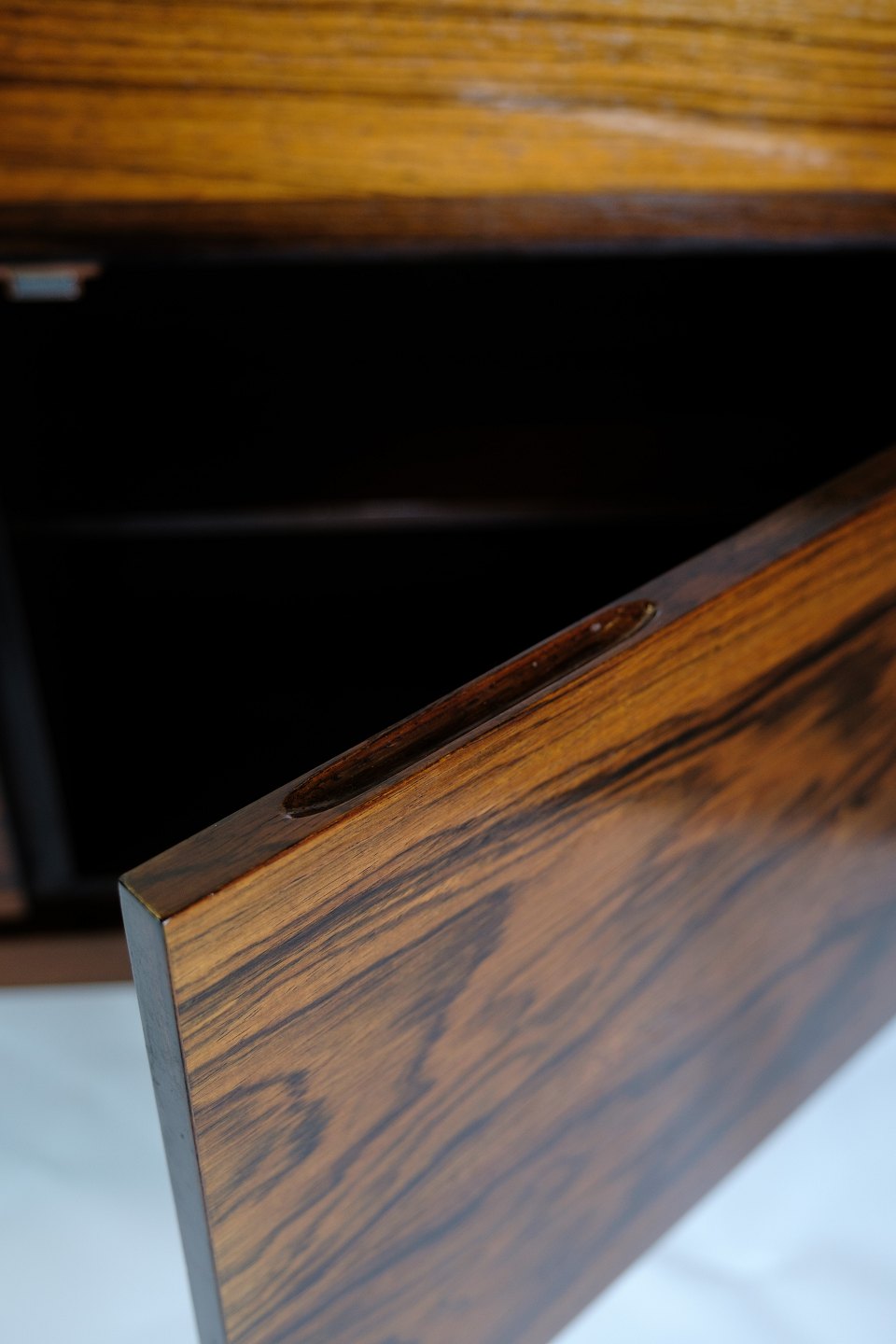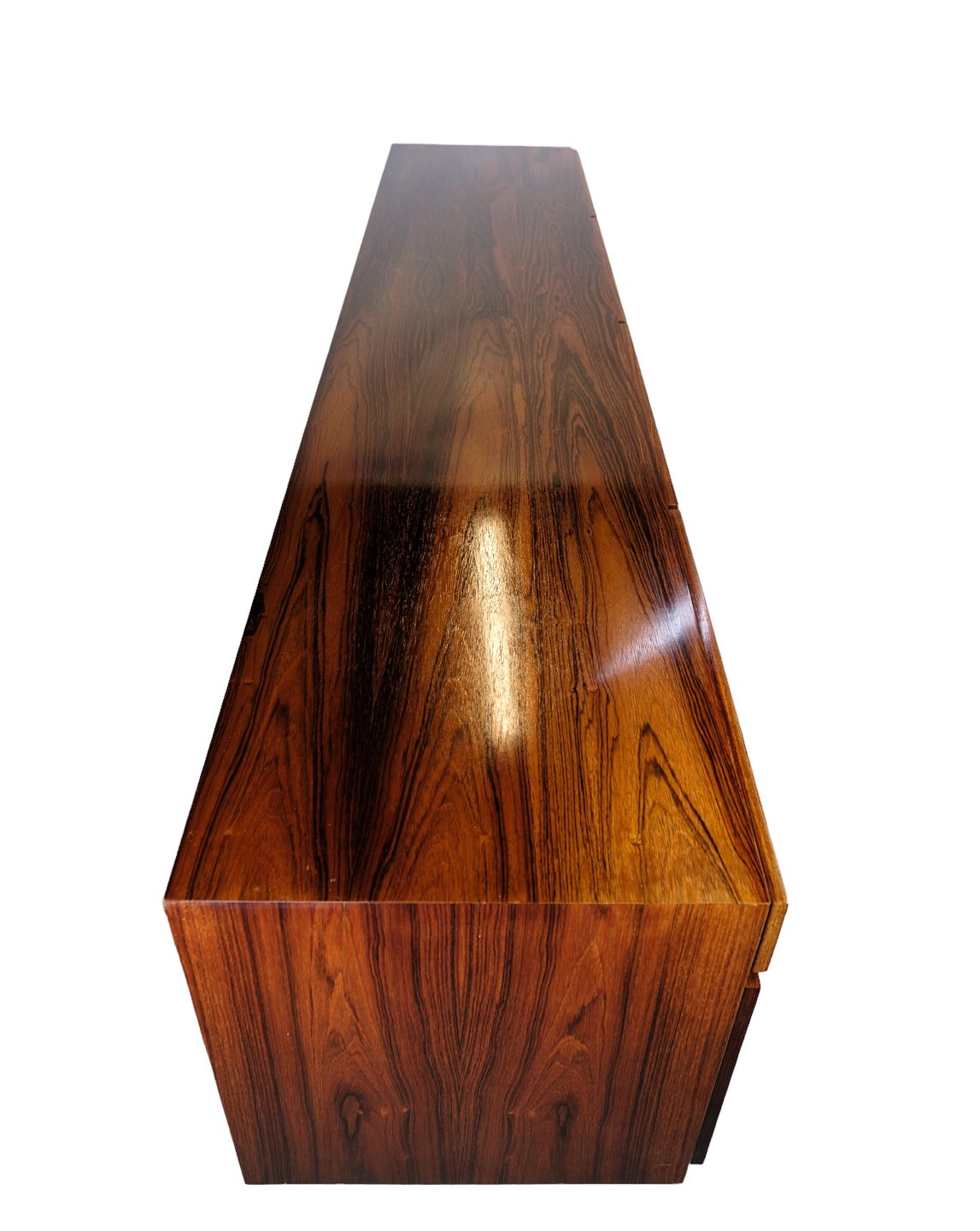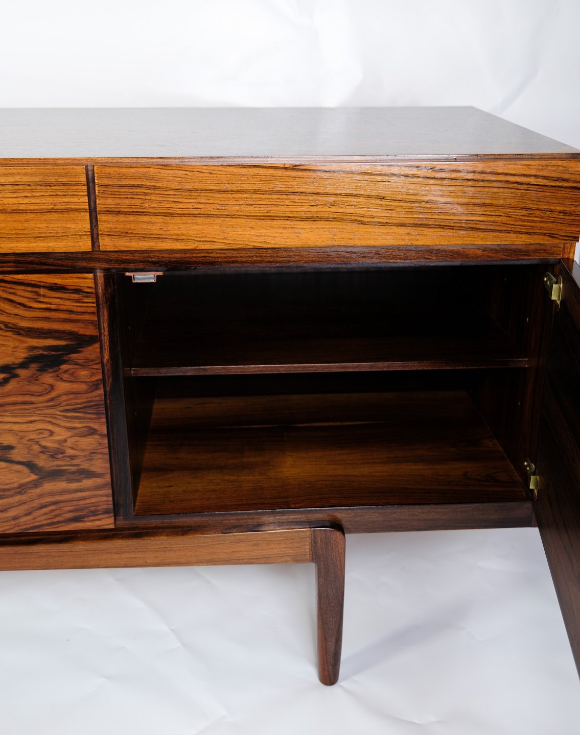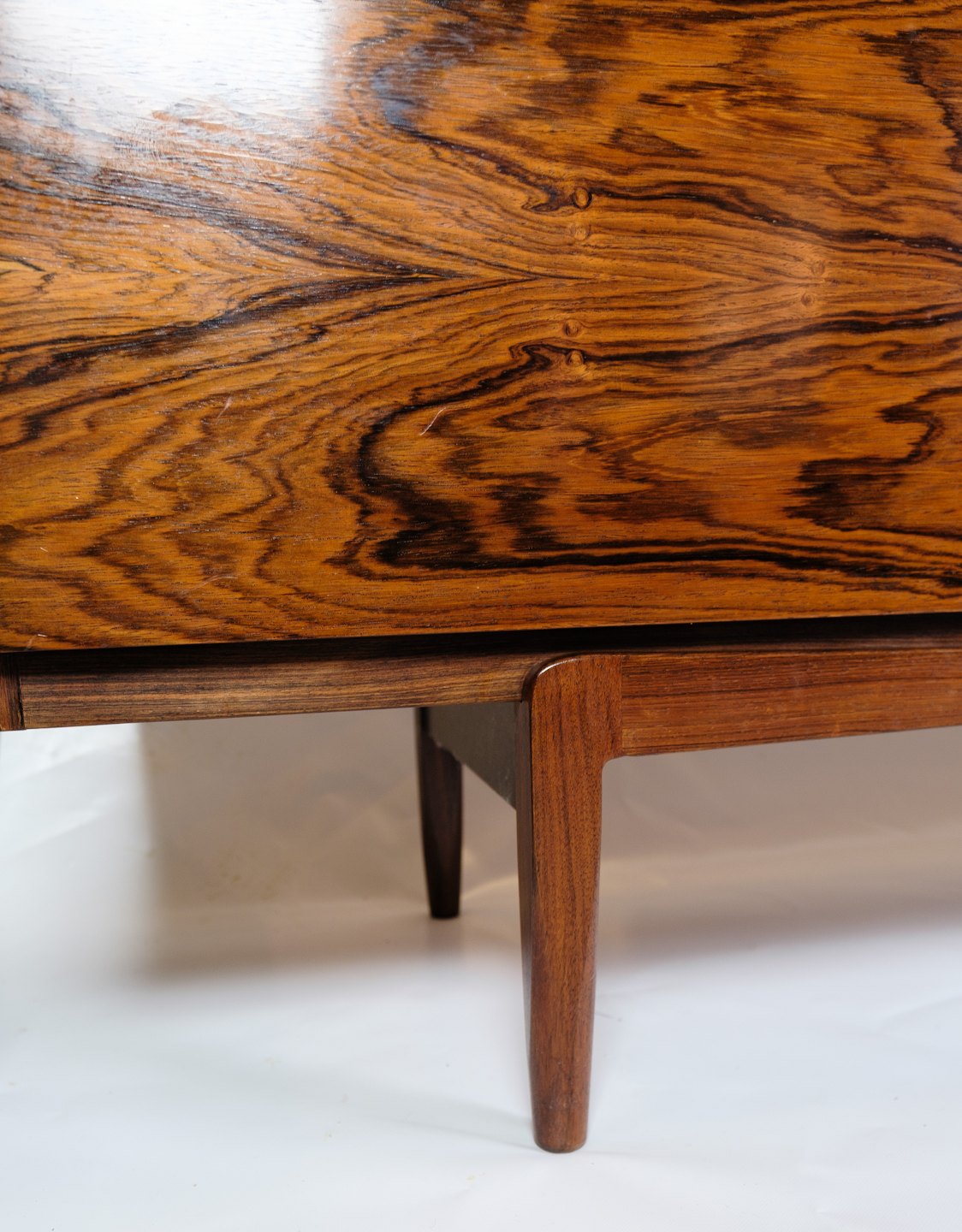 SolgtEn skænk i palisander designet af Ib Kofod-Larsen, model FA66, fremstillet hos Faarup Møbelfabrik i 1960'erne, er en sand perle af håndværksmæssig kvalitet. Denne lave, fritstående skænk udmærker sig ved sin fortræffelige udførelse i palisanderfinér med en fortryllende struktur.