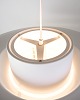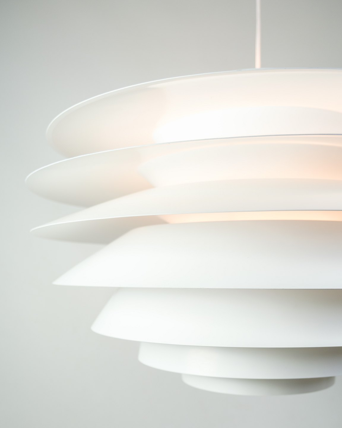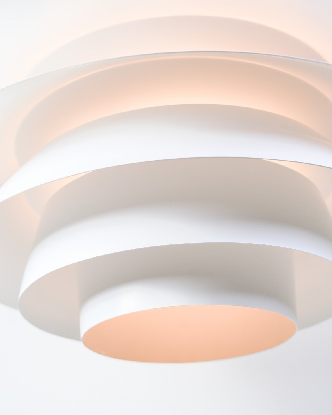 Lampens krop, udført i hvid lakeret metal, udstråler en subtil glans og skaber en visuel lethed. Den ovale form tilføjer et moderne touch, samtidig med at den bevarer en klassisk og alligevel sofistikeret æstetik. Den bløde bue og symmetri i designet gør denne loftlampe til mere end blot en lyskilde; den bliver en kunstnerisk erklæring, der forvandler ethvert rum.