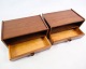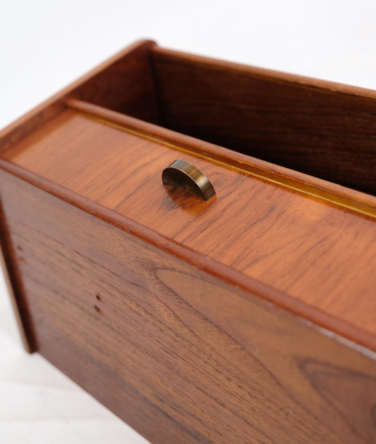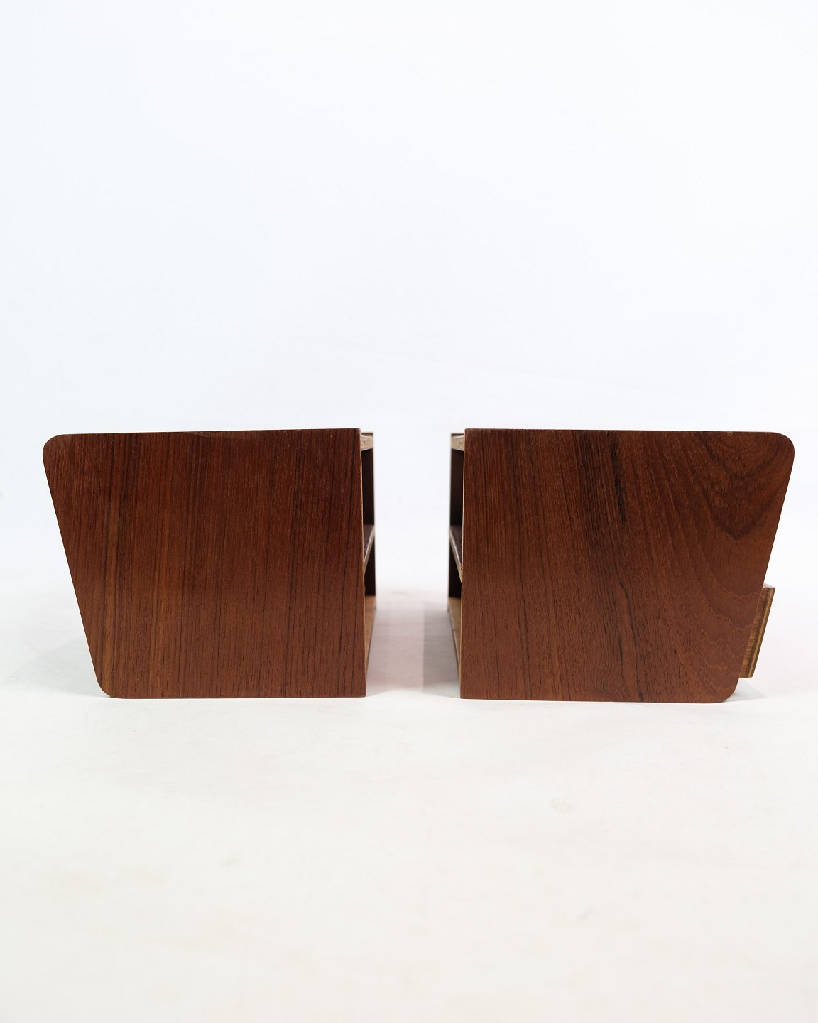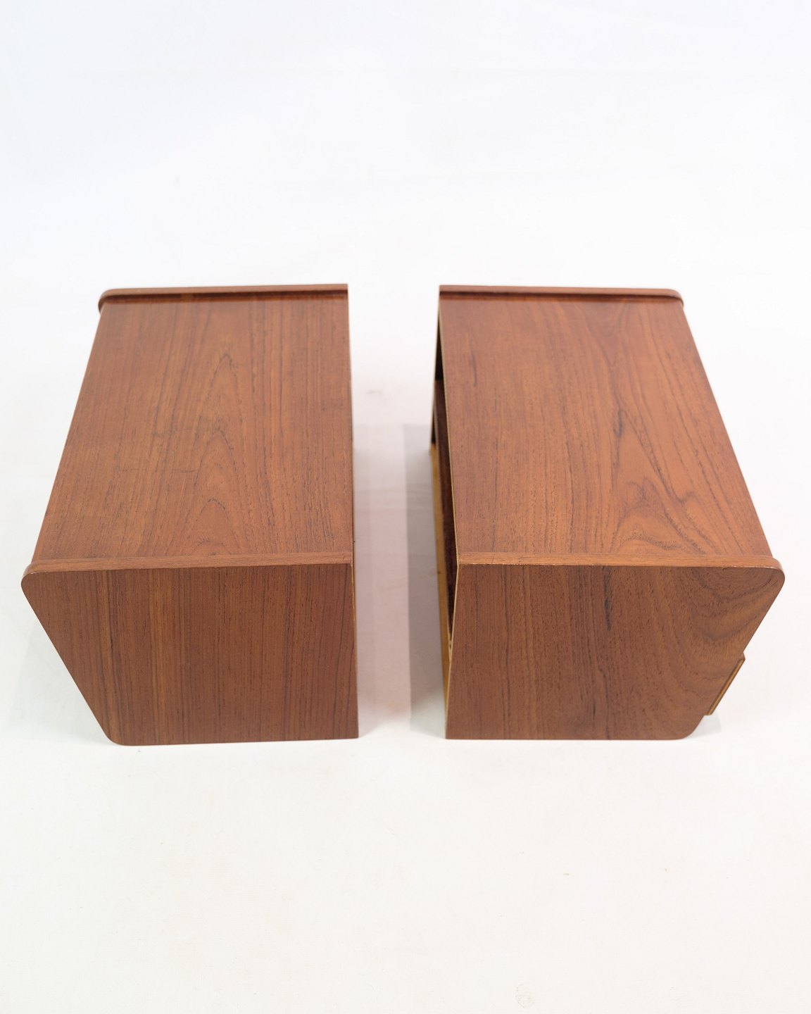 SoldWall-hung bedside tables of Danish design in teak wood from the 1960s with a shelf and drawer, equipped with brass handles. These bedside tables combine functionality and aesthetics with the warm expression of the teak wood and the elegant touch of the brass handles. The wall-hung construction provides a modern and space-saving element for the bedroom. A typical example of Danish furniture design from the 1960s, which is still sought after for its craftsmanship and stylish appearance.