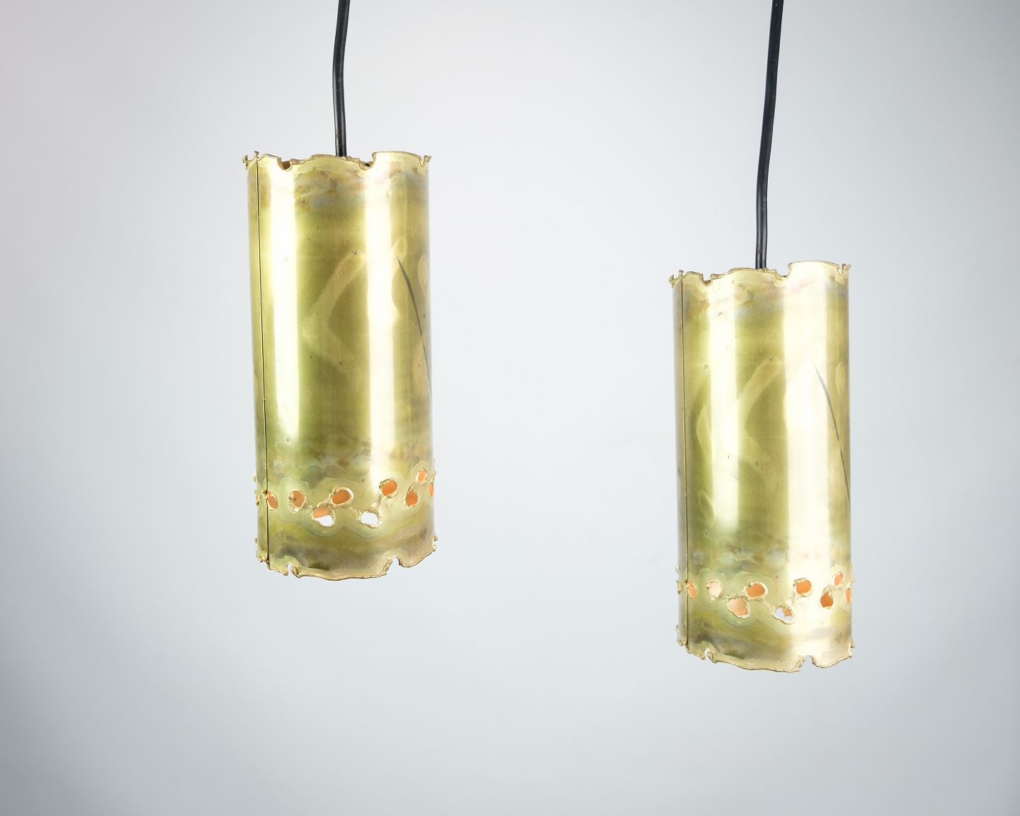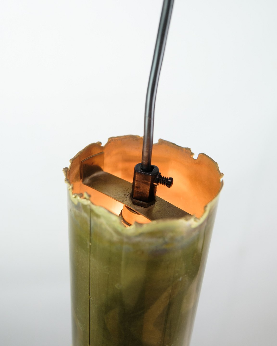 The brass ceiling lamp, characterized by a characteristic cylinder shape and a black cord, is a remarkable example of lighting design from the 1960s, created by the talented designer Sven Aage Holm Sørensen. This iconic piece captures the spirit of Danish modernism with its simple yet elegantly crafted structure.