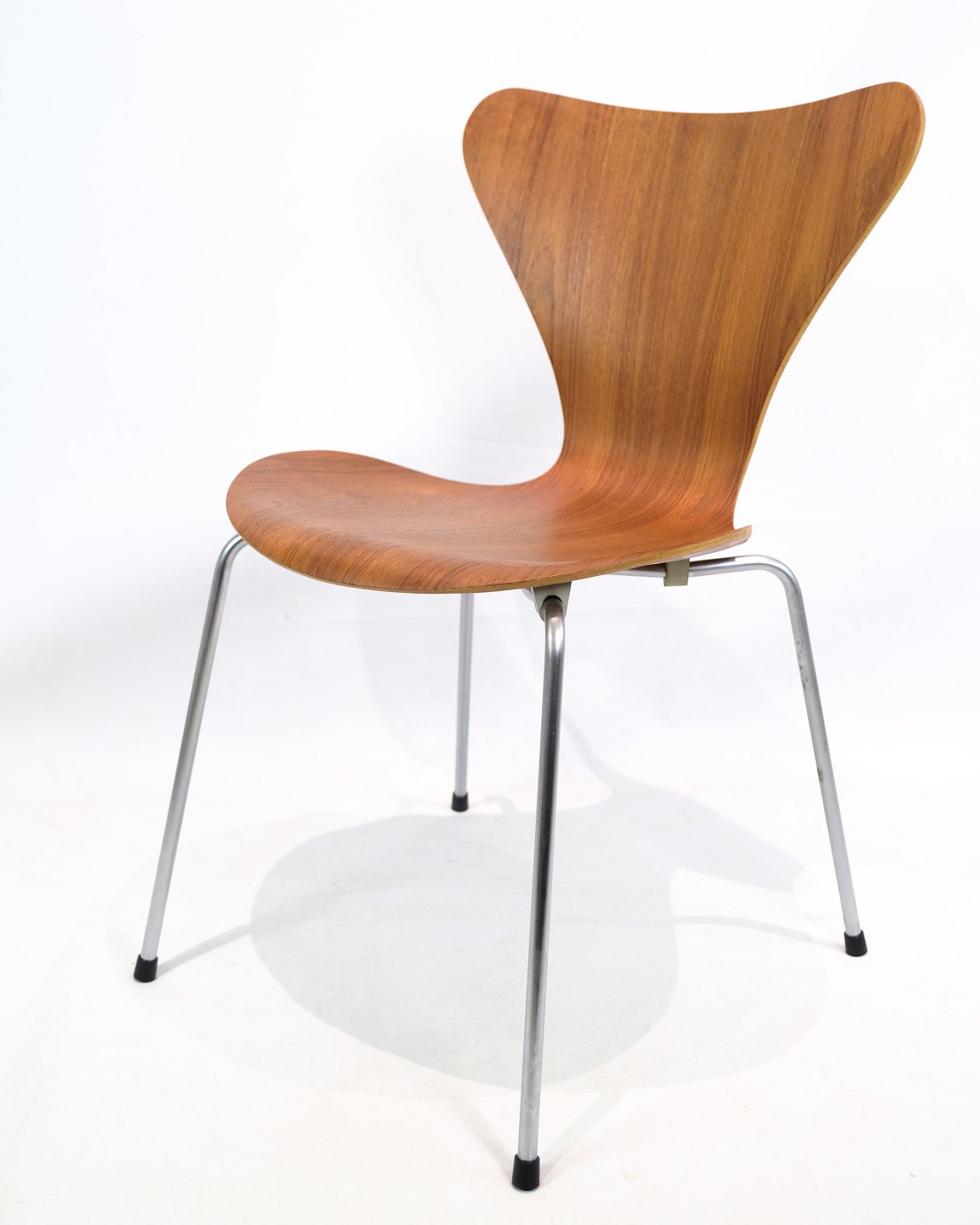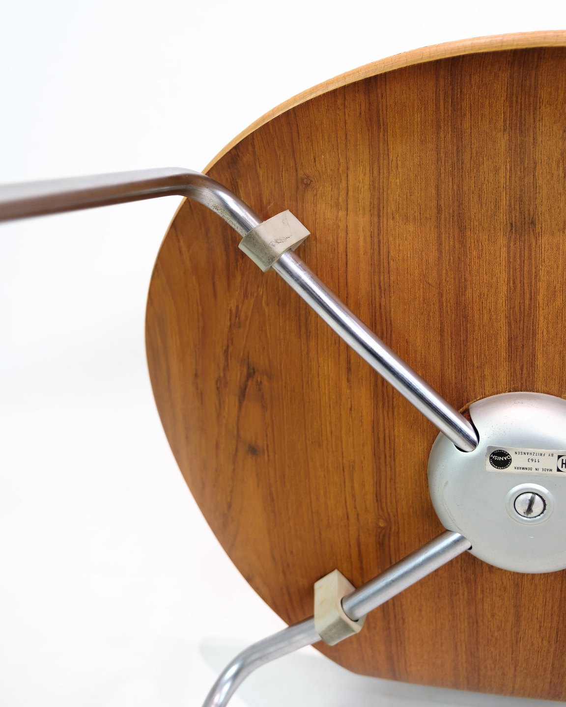 Arne Jacobsen er en af de mest anerkendte danske designere, og hans "Syver" stol er blevet et symbol på dansk modernisme og funktionalitet. Stolens enkle og elegante design, kombineret med det varme udtryk af teaktræ, gør den ideel til ethvert spisebord eller som et smukt accentstykke i hjemmet.