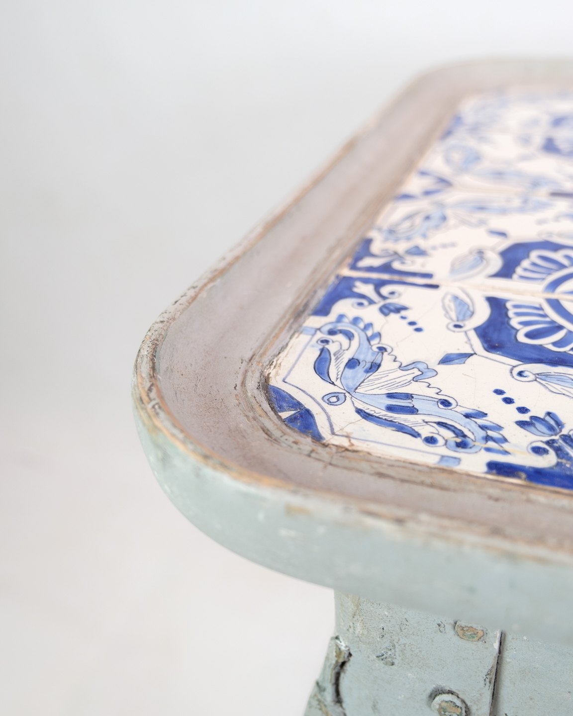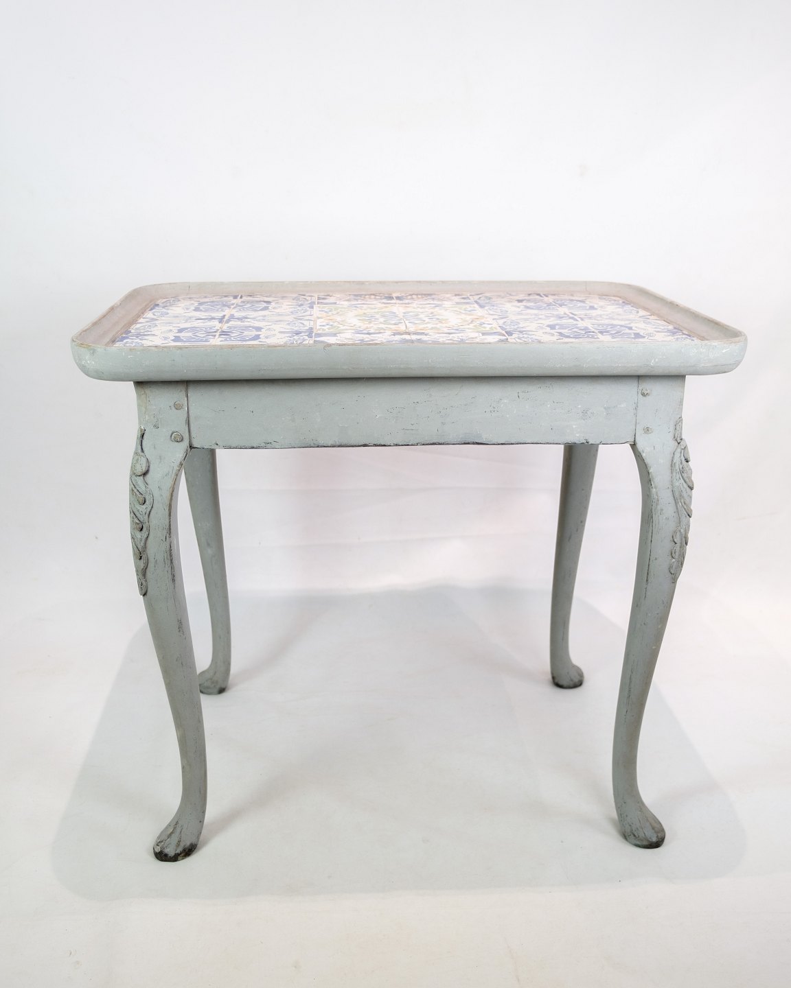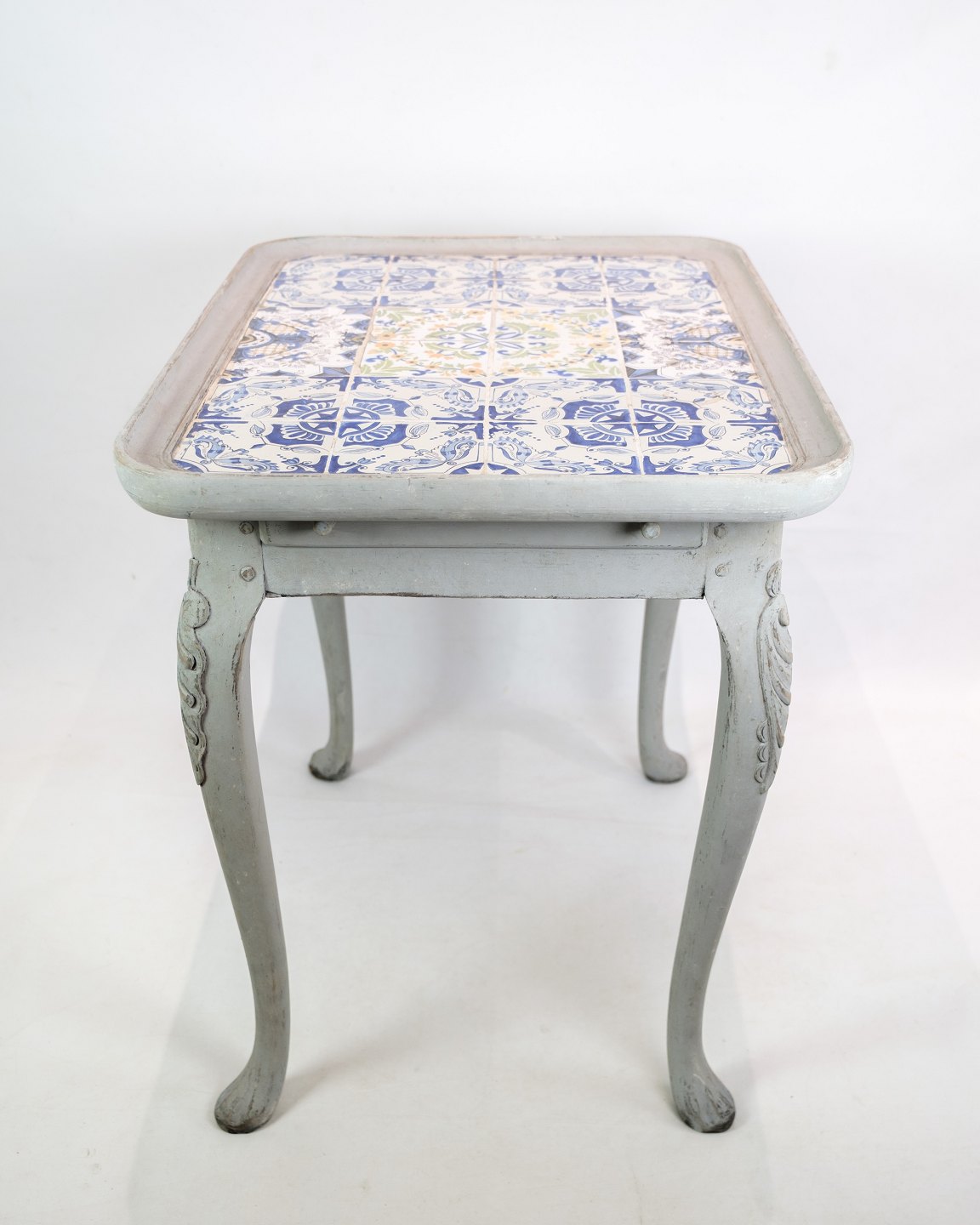 The rococo tile table, painted gray and dated 1780, is a charming example of classic furniture design. Its elegantly curved forms and refined detailing are characteristic of the period and add a historical charm to any room. This timeless piece of furniture is a beautiful and functional addition to any interior with its unique aesthetic and historical value.