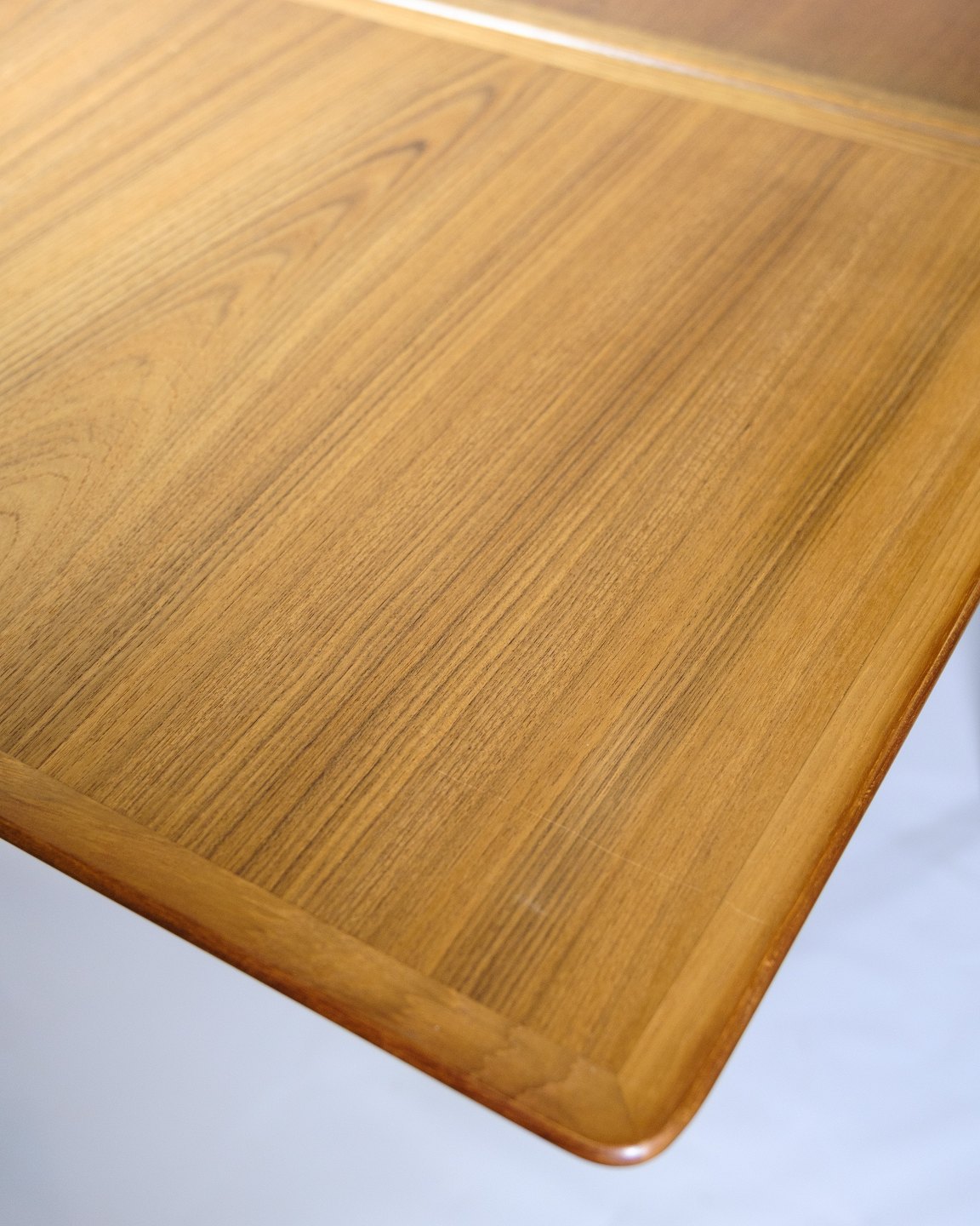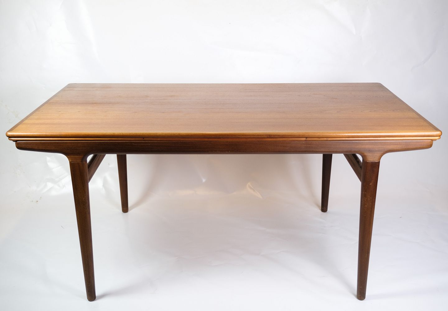 The teak dining table, created by the talented furniture designer Johannes Andersen and manufactured by Uldum Møbelfabrik in 1960, is an impressive piece of Danish furniture art. With its elegant design and craftsmanship, it makes a beautiful and functional addition to any dining area.