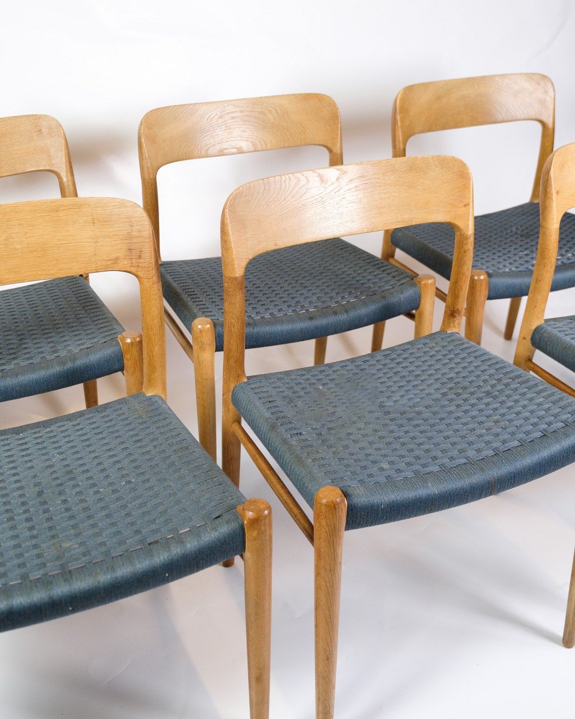 Sættet af seks spisebordsstole, kendt som Model 75, er et fremragende eksempel på dansk møbeldesign fra 1960'erne. Disse stole, designet af den anerkendte møbelarkitekt Niels O. Møller og fremstillet af J.L. Møllers Møbelfabrik, repræsenterer en sublim kombination af æstetik, funktionalitet og håndværksmæssig ekspertise.
